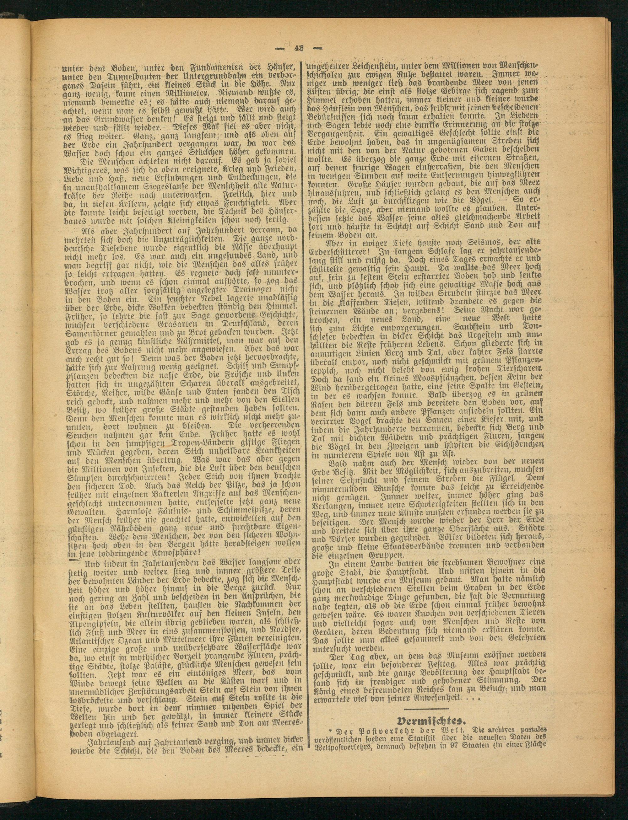 In einem Lande bauten die strebsamen Bewohner eine große Stadt, die Hauptstadt. Und mitten hinein in bte Hauptstadt wurde ein Museum gebaut. Man hatte nämlich schon an verschiedenen Stellen beim Graben in der Erde ganz merkwürdige Dinge gefunden, die fast die Vermutung nahe legten, als ob die Erde schon einmal früher bewohnt gewesen wäre. Es waren Knochen von verschiedenen Tieren und vielleicht sogar auch von Menschen und Reste von Geräten, deren Bedeutung sich niemand erklären konnte. Das sollte nun alles gesammelt und von den Gelehrten untersucht werden. . ....... ..