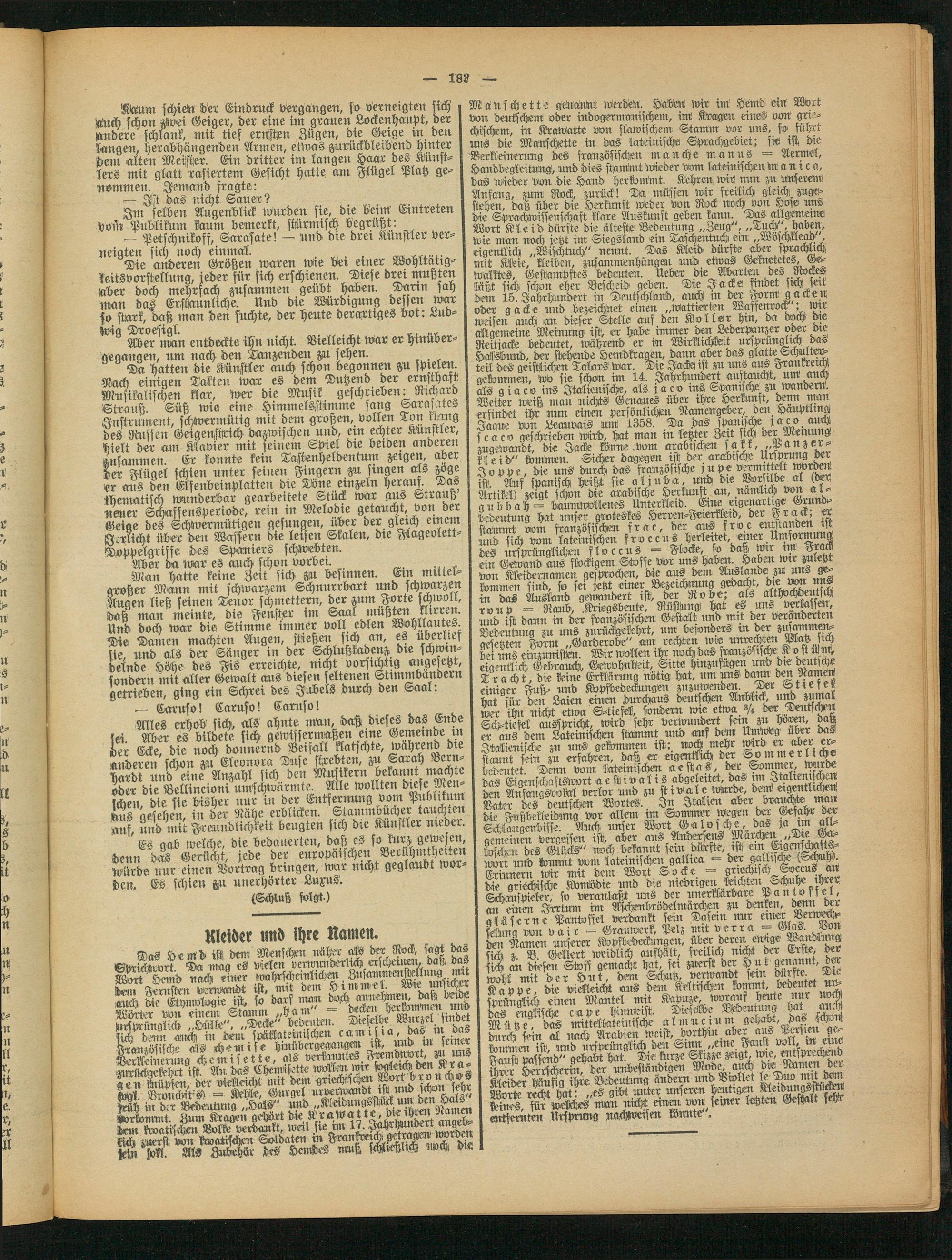 I juöxt und kommt vom lateinischen galltca = bet gaUilÄ ('Lchuh). I Erinnern wir mit dem Wort Socke. -- grtechtschSaccuscur I die griechische Komödie und dta ntedrtgen letchtrt. schuhe ihrer j Schtuspieler, so veranlaßt uns der imerklarbare P a n t 0 f f el, I an einen Irrtum int Aschenbrödelmarchen zu denken, ^n1 der gläserne Pantoffel verdankt fein Dasein nur Eer Vernich,- selnng von vair = Grauwerk, Wlz nut perra— Glas. Bon den Namen unserer Kopfbedeckungen, üb«r deren ewige ^andumg lick« » B Gellert weidlich aushalt, freilich Nicht der Erste, der 3 L Ls^ SE gemacht hat, sei zuerst der Hut genannt, der wobl mit der Hut, dem Schutz, verwandt fern durfte Die Kappe, die vielleicht aus dem Keltischen kommt, bedeutet u - lvrünalich einen Mantel mit Kapuze, worauf heute nur noch dÄ enLL cape hnwmst. TiesMe Mdemung hat mich Mütze das mittellateinische almuctum gehabt, Pas schot, ftMinmit ist imd ursprünglich den LiNN „eme Fault vvtt, rn ernr Faust passend" gehabt hat. Die kurze Skizze zeigt, wie, mckv-r«.rend ihrer Herrscherin, der unbeständigen Mode, auch die Namen der toMher lÄiniia ihre Bedeutung ändern und Biollet le Diw utit dcin M^rÄftTat:,Sgibt unter unseren heutigen KleidtmgsstückM feütC§ für welche man nicht einen von ferner letzten Gestalt sehr entfernten Urfbnmg nachweisen könnte'.