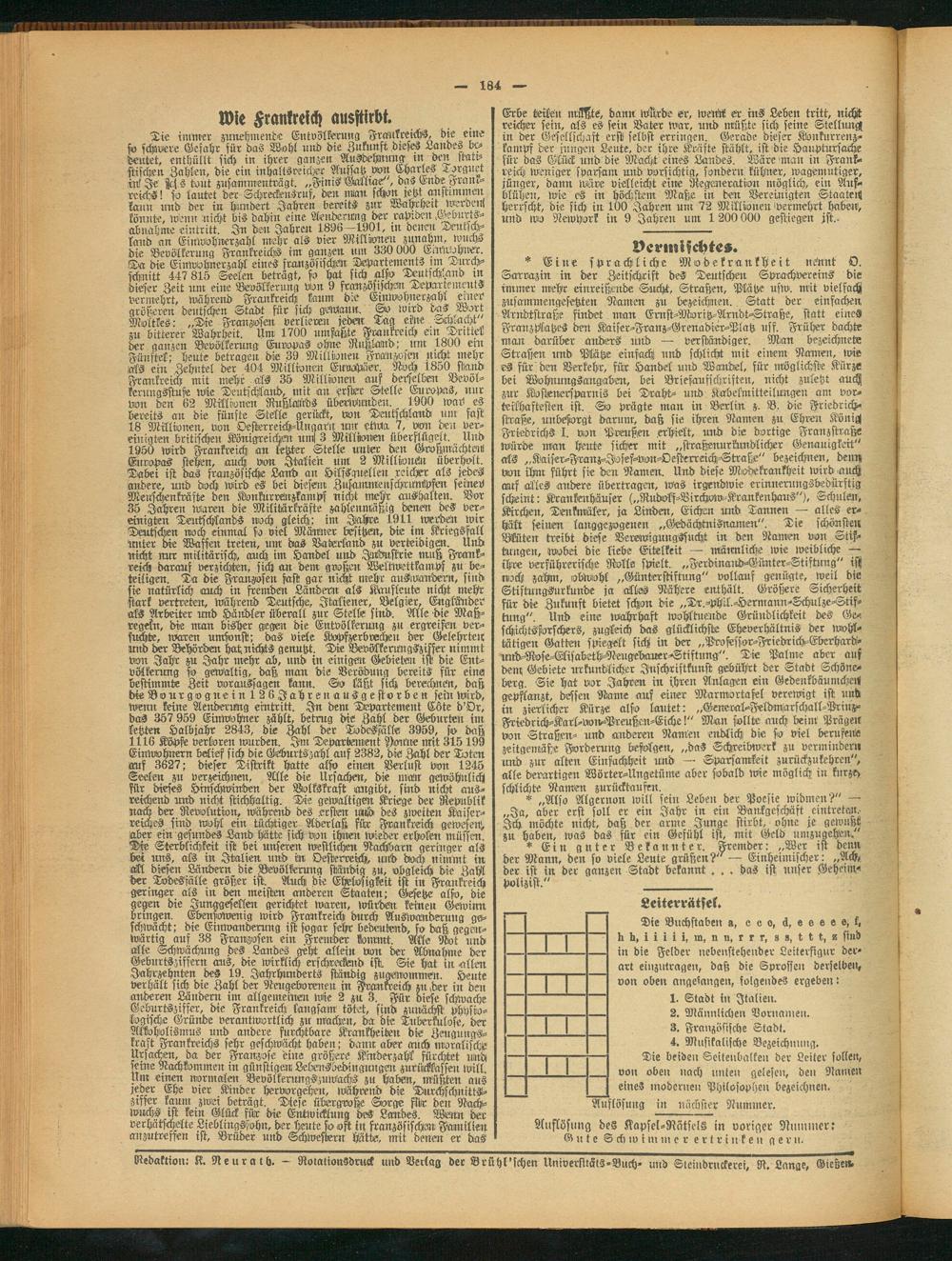 Redaktion: K. Neurath. - Rotationsdruck unb Verlag der Brühl'scheu Univerfitäts-Buch- und Steindruckerei, N. Lange, Gießen.
