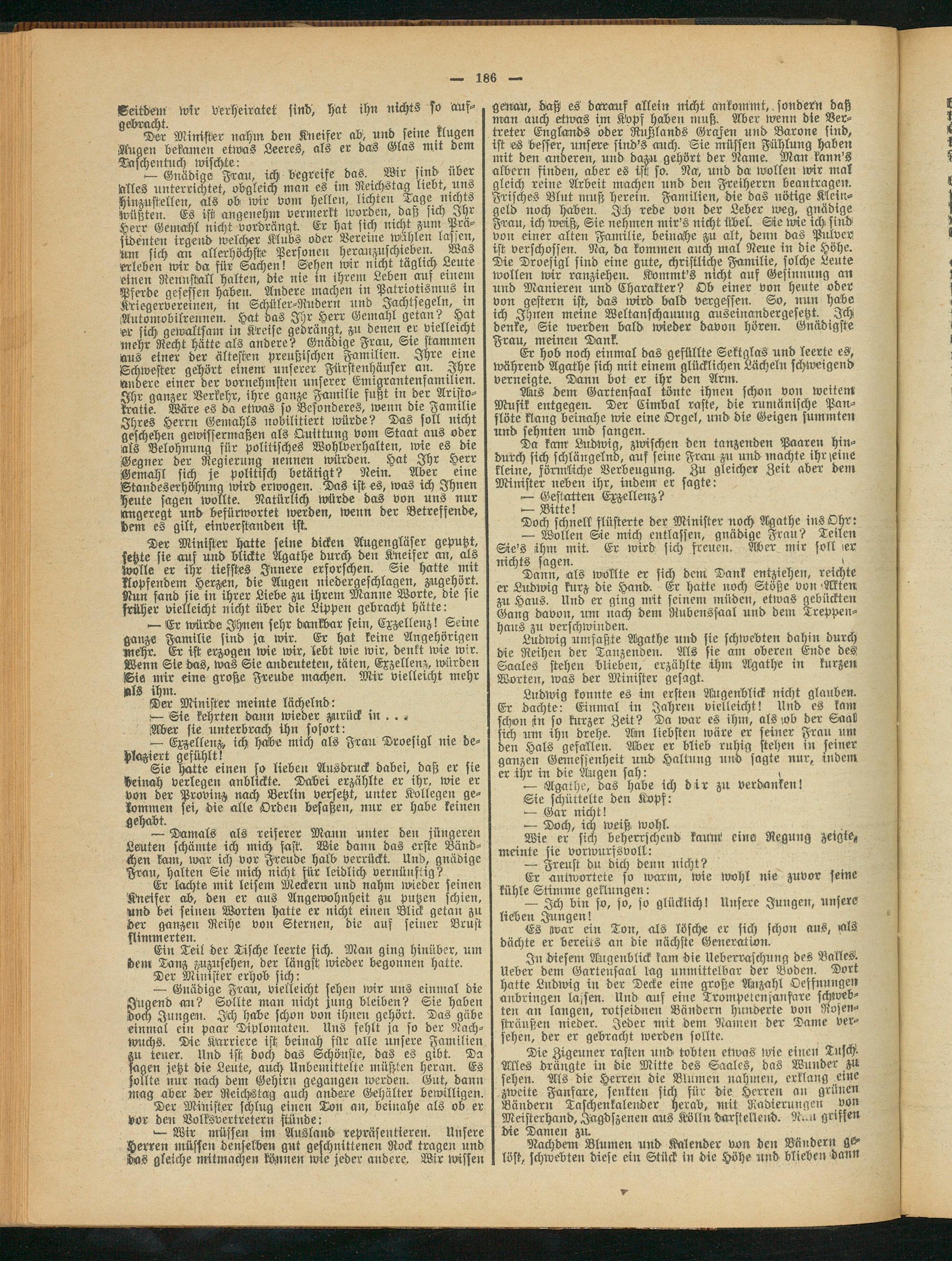 —- Gnädige Frau, vielleicht sehen wir uns einmal die JUgend an? Sollte man nicht jung bleiben? Sie haben doch Jungen. Ich habe schon von ihnen gehört. Das gäbe einmal ein paar Diplomaten. Uns fehlt ja so der Nachwuchs. Die Karriere ist beinah für alle unsere Familien zu teuer. Und ist doch das Schönste, das es gibt. Da sagen jetzt die Leute, auch Unbemittelte müßten heran. Es sollte nur nach dem Gehirn gegangen werden. Gut, bann mag aber der Reichstag auch andere Gehälter bewilligen.