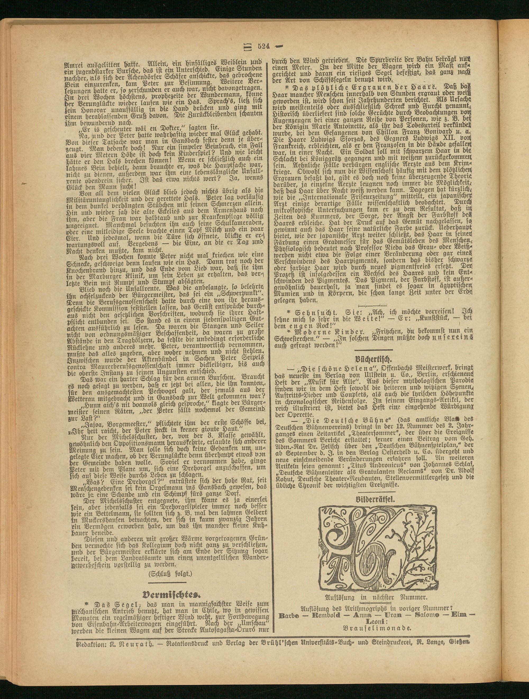 Redaktion: K. Neurath. - Rotationsdruck und Verlag der Brühl'schen Universitäts-Buch, und ©teinbrueferei, R. Lange, Gießen,