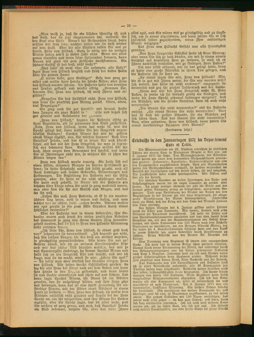 Die Winterquartiere der 22. Division erreichten in niedlichen; Tälern der oberen Eure in Mainkenon Mogenl le Roi usiv. am 3. Januar 1871 ihr Ende. Ten Weihnachtsabeild, den «ilvester- abend hatten wir unter dem brennenden Weihuachtsbaum gemein» sam gegiert: Infanterie-, Kavallerie-, Artulerleostiziere und alle Den Truppenteilen augehörendeir Aerzte. Auch alte Mannschasten Hattert sich Weihnachtsbäume verschafft, sie standen massenhait im Gemisch mit Laubhvlzern auf Den (teilen Höhen, die uns umgaben. Tie Forstbehörde hatte nichts hineinzureden. Wir fühlten uns hier als die Herren.