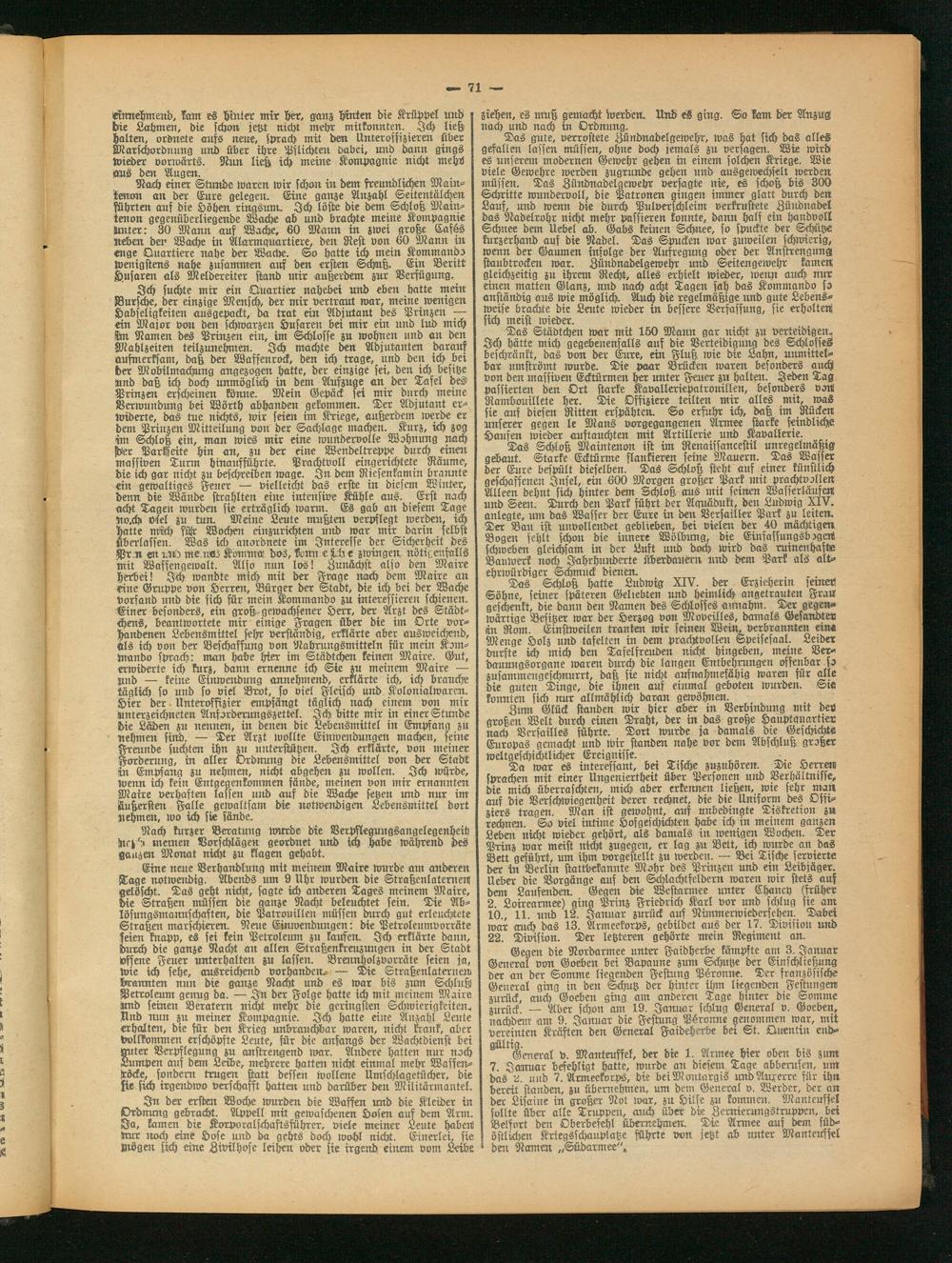 Ta war es interessant, bet Tische zuzuhoren. Die Herren sprachen mit einer Ungeniertheit über Personen uitb Verhältnisse, die mich überraschten, mich aber erkennen ließen, wie sehr man auf die Verschwiegenheit derer rechnet, die die Uniform des Offiziers trauen. Man ist gewohnt, auf unbedingte Diskretion zu rechnen. So viel intime Hofgeschichten habe ich in meinem ganzen Leben nicht wieder gehört, als damals in wenigen Wochen. Der Prinz war meist nicht zugegen, er lag zu Bett, ich wurde an das Bett geführt, um ihm vorgestellt zu werden. — Bei Tische servierte der in Berlin stattbekannte Mohr des Prinzen und ein Letbjäger. lieber die Vorgänge auf den Schlachtfeldern waren wir stets auf dem Laufenden. Gegen die Westarmee unter Chancy (früher 2. Loirearmee) ging Prinz Friedrich Karl vor und schlug sie am 10., 11. und 12. Januar zurück auf Nimmerwiedersehen. Dabei war aud) das 13. Armeekorps, gebildet aus der 17. Division und 22. Division. Der letzteren gehörte mein Regiment an.