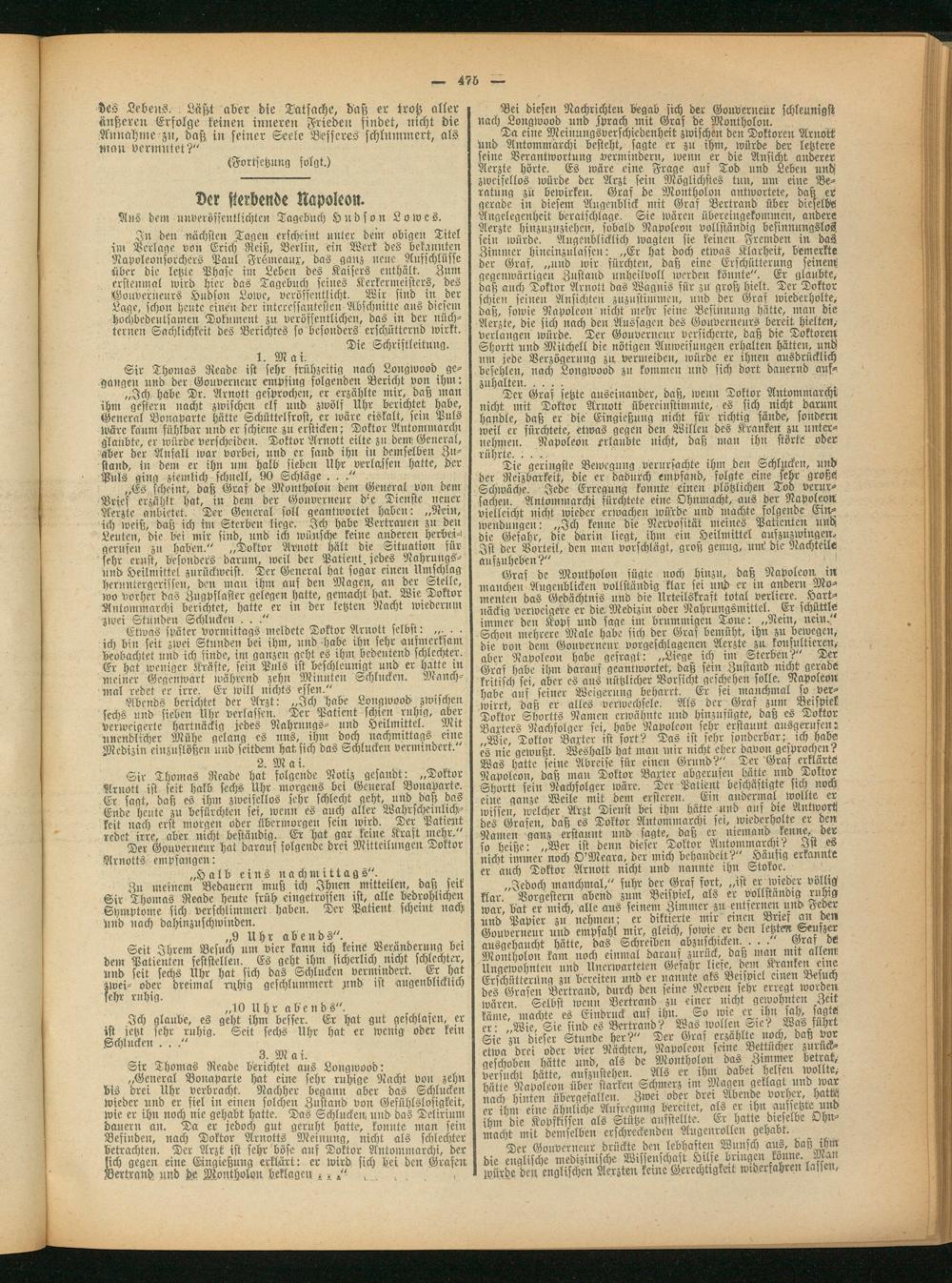 Abends berichtet der Arzt: „Ich habe Longwood zwischen sechs und sieben Uhr verlassen. Ter Patient schien ruhig, aber verweigerte hartnäckig jedes Nahrungs- und Heilmittel. Mit unendlicher Mühe gelang es uns, ihm doch nachmittags eine Medizin einzuflößen und seitdein hat sich daS Schlucken vermindert.