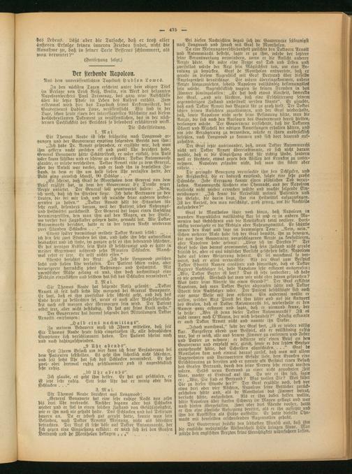 Graf de Montholon fügte noch hinzu, daß Napoleon in maucheit Augenblicken vollständig klar sei und er in andern Momenten das Gedächtnis und die Urteilskraft total verliere. Hartnäckig verweigere er die Medizin oder Nahrungsmittel.^ Er schüttle immer den Kopf und sage im brummigen Tone: „Nein, nein.. Schon mehrere Male habe sich der Graf bemüht, ihn zu bewegen, die von dem Gouverneur vorgeschlagenen Aerzte zu kousultteren, aber Napoleon habe gefragt: „Liege ich im Sterben? Der Graf habe ihm darauf geantwortet, daß sein Zustand nicht gerade kritisch sei, aber cs aus nützlicher Vorsicht geschehen solle. Napoleon habe auf seiner Weigerung beharrt. Er sei manchmal so verwirrt, daß er altes verwechsele. Als der Graf zum Beispiel! Doktor Shortts Namen erwähnte und hinzufügte, daß es Doktor Baxters Nachfolger sei, habe Napoleon sehr erstaunt ausgerufen: „Wie, Doktor Baxter ist fort? Das ist sehr sonderbar;, ich Habs eö nie geivußt. Weshalb hat man mir nicht eher davon gesprochen? Was hatte seine Abreise für einen Grund?" Der Gras erklärte! Napoleon, daß man Doktor Baxter abgerusen hätte und Doktor Shortt sein Nachfolger wäre. Ter Patient beschästigte sich noch eine ganze Weile mit dem ersteren. Ein andermal wollte er wissen, welcher Atzt Dienst bei ihm hätte und ans die Antwortj des Grafen, daß es Doktor Antommarchi sei, wiederholte er den Namen ganz erstaunt und sagte, daß er niemand kenne, der so heiße: „Wer ist denn dieser Doktor Antommarchr? Ist es nicht immer noch O'Meara, der mich behandelt?" ^Häufig erkannte er auch Dottor Arnott nicht und nannte ihn «tokoe.