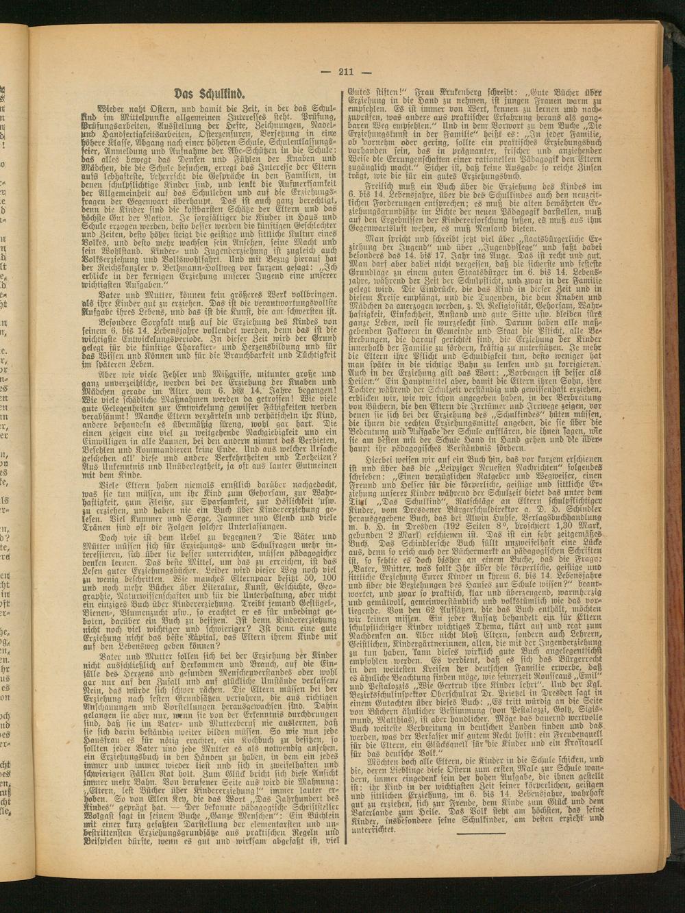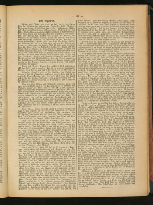 Besondere Sorgfalt muß auf die Erziehung des Kindes von seinem 6. bis 14. Lebensjahre vollendet werden, denn das ist die wichtigste Entwickelungsperiode. In dieser Zeit wird der Grund gelegt für die künftige Charakter- und Herzensbildung und für das Wissen unb Können und für die Brauchbarkeit unb Tüchtigkeit im späteren Leben.
