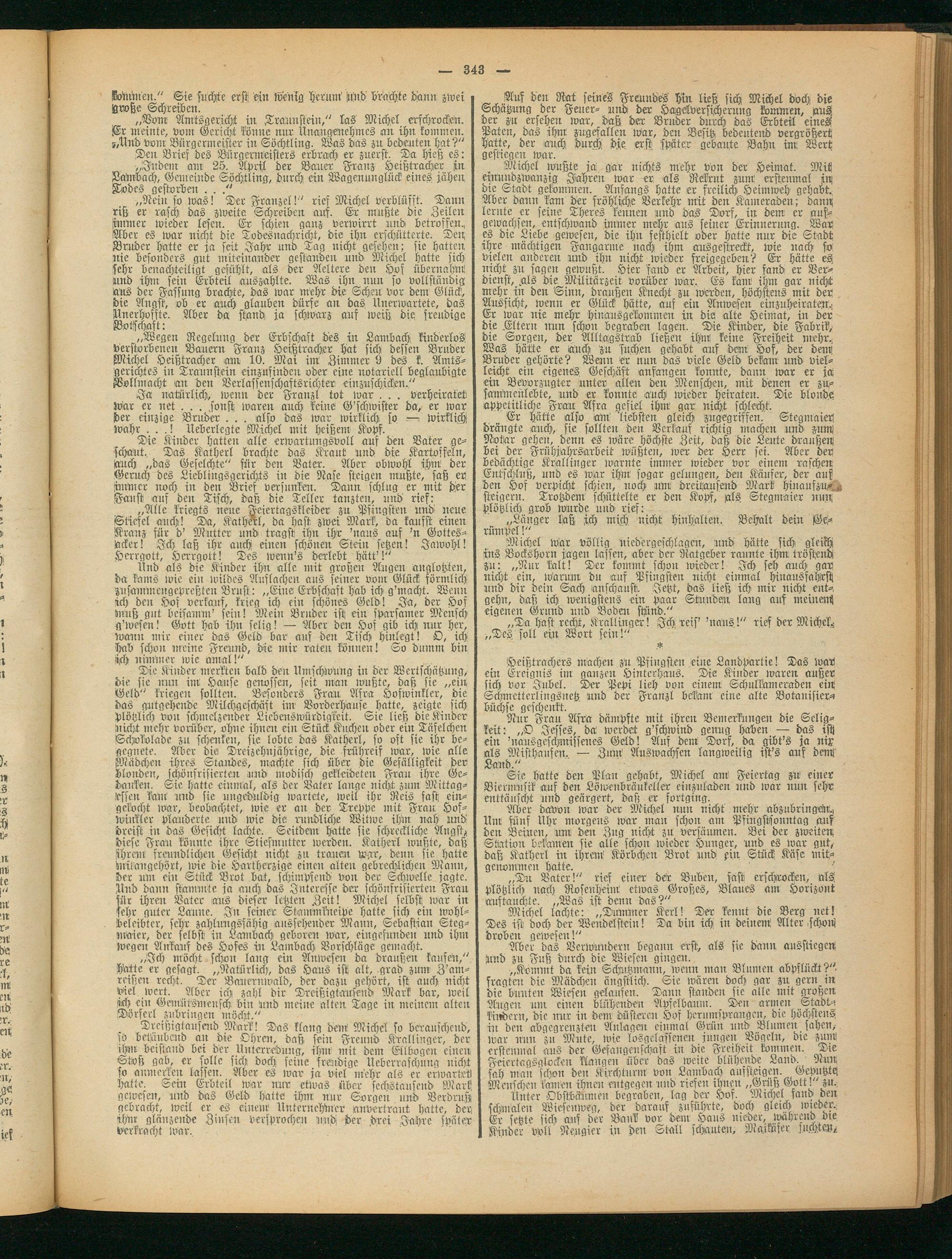 Und als die Kinder ihn alle mit großen Augen anglotzten, da Fants wie ein wildes Auflachen ans seiner vom Glück förmlich zusammengepreßten Brust: „(Sitte Erbschaft hab ich g'macht. Wenn ich den Hof verkauf, krieg ich ein schönes Geld! Ja, der Hof Muß gut beisamm' sein! Mein Bruder ist ein sparsamer Mensch g'wesen! Gott hab ihn selig! — Aber den Hof gib ich nur her, wann mir einer das Geld bar auf den Tisch hinlegt! O, ich hab schon meine Freund, die mir raten können! So dumm bin ich niminer wie total!"