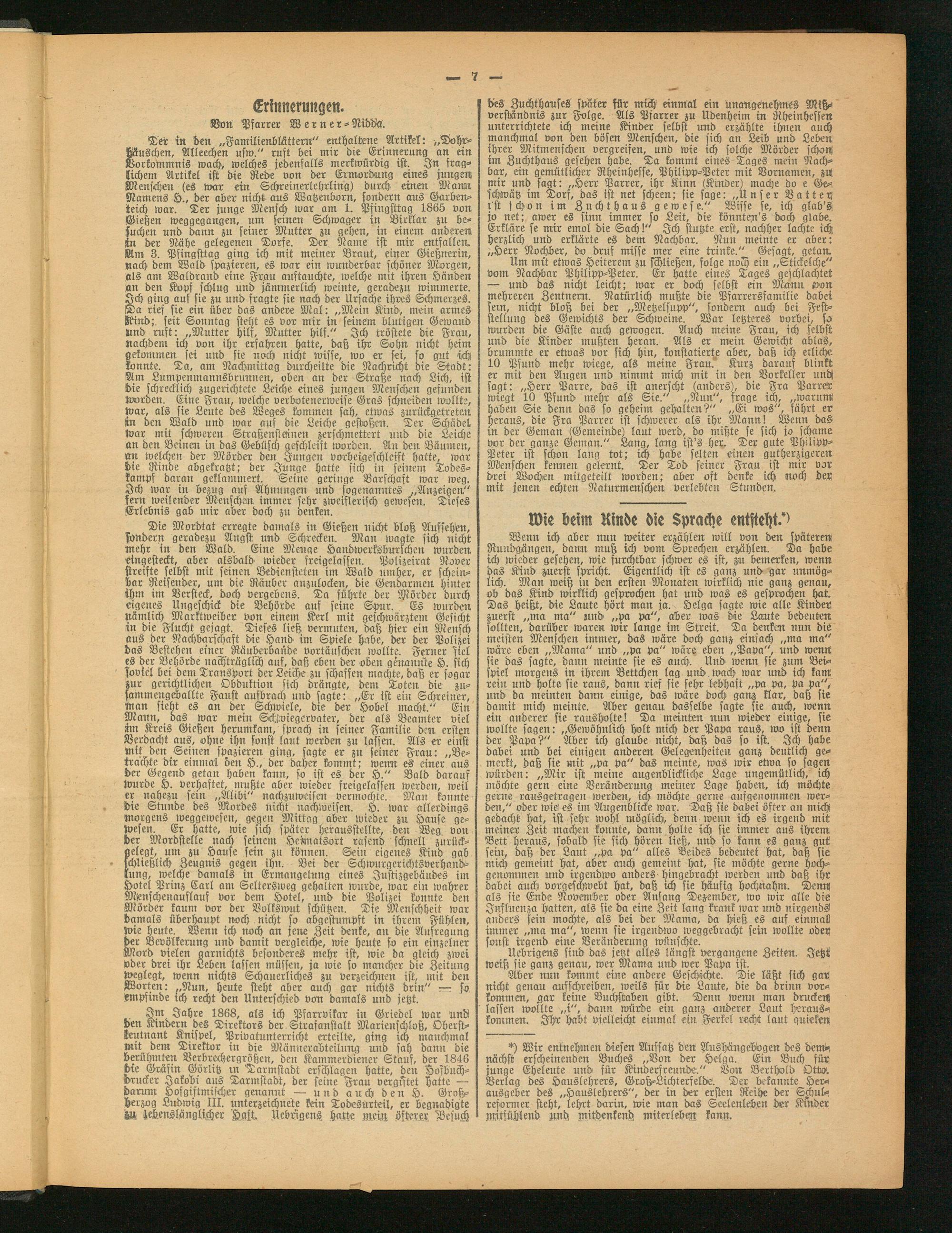 des Zuchthauses später für mich einmal ein unangenehmes Mißverständnis zur Folge. Als Pfarrer zu Udenheim in Rheinhessen unterrichtete ich meine Kinder selbst und erzählte ihnen auch manchmal von den bösen Menschen, die sich an Leib und Leben ihrer Mitmenschen vergreifen, und wie ich solche Mörder schon! im Zuchthaus gesehen habe. Ta kommt eines Tages mein Nachbar, ein gemütlicher Rheinhesse, Philipp-Peter mit Vornamen, zuj mir und sagt: „Herr Parrer, ihr Kinn (Kinder) mache do e Geschwätz im Torf, das ist net scheen; sie sage: „Unser Vatter; ist schon im Zuchthaus gewese." Wisse se, ich glab’Si jo net; am er es sinn immer so Seit, die könnt en's doch glabe. Erkläre se mir emol die Sach!" Ich stutzte erst, nachher lachte ich herzlich und erklärte es dem Nachbar. Nun meinte er aber: „Herr Nachher, do druf misse in er eine trinke." Gesagt, getan.