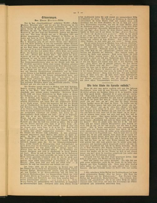 Um mit etwas Heiterem zu schließen, folge noch ein „Stickelche" vom Nachbar Philipp-Peter. Er hatte eines Tages geschlachtet — und das nicht leicht; war er doch selbst ein Mann iv-on mehreren Zentnern. Natürlich mußte die Pfarrersfamilie dabei sein, nicht bloß bei der „Metzelsupp", sondern auch bei Feststellung des Gewichts der Schweine. War letzteres vorbei, so wurden die Gäste auch gewogen. Auch meine Frau, ich selbst und die Kinder mußten heran. Als er mein Gewicht ablas, brummte er etwas vor sich hin, konstatierte aber, daß ich erliche 10 Pfund mehr wiege, als meine Frau. Kurz darauf blinkt er mit den Augen und nimmt mich mit in den Vorkeller uuds sagt: „Herr Parre, das ist anerscht (anders), die Fra Parrckr wiegt 10 Pfund mehr als Sie." „Nun", frage ich, „warum! haben Sie denn das so geheim gehalten?" „Ei wos", führt er heraus, die Fra Parrer ist schwerer als ihr Mann! Wenn das in der Geman (Gemeinde) laut werd, do mißte se sich jo schäme vor der ganze Geman." Sang, lang ist's her. Der gute Philipp- Peter ist schon laug tot; ich habe selten einen gutherzigeren Menschen kennen gelernt. Der Tod seiner Frau ist mir vor drei Wochen mitgeteilt worden; aber oft denke ich noch der mit jenen echten Naturmenschen verlebten Stunden,