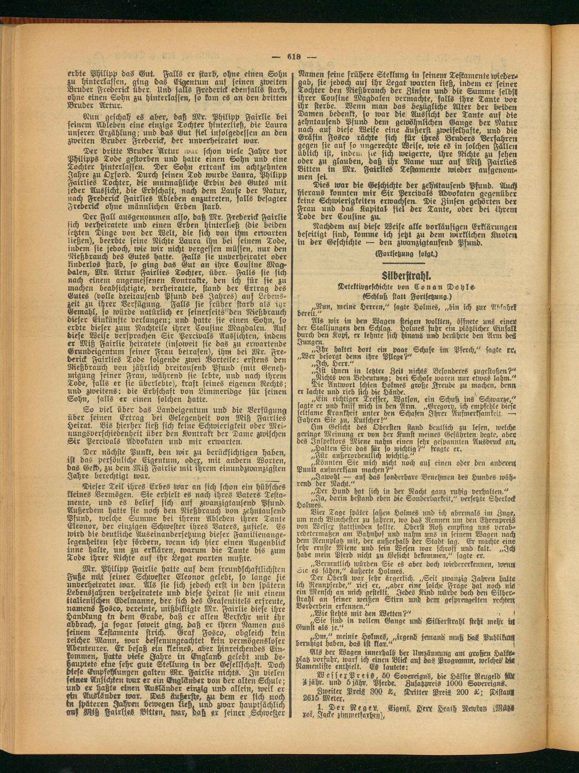 Vier Tage später saßen Holmes und ich abermals im Zuge, um nach Winchester zu fahren, wo das Rennen um den Ehrenpreis von Wessex stattfinden follte. Oberst Roß empfing uns verab- redetermaßen am Bahnhof und nahm uns in seinem Wagen nach dem Rennplatz mit, der außerhalb der Stadt lag. Er machte eine sehr ernste Miene und sein Wesen war schroff und kalt. „Ich habe mein Pferd nicht zu Gesicht bekommen," sagte er.