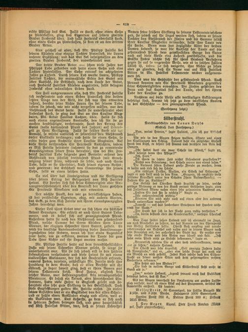 Mr. Philipp Fairlie hatte auf dem freundschaftlichsten Fuße irtijt seiner Schwester Eleonor gelebt, so lange sie unverheiratet war. Ms sie sich jedoch erst in den spütern Lebensjähren verheiratete und diese Heirat sie mit einem italienischen Edelmanne, der sich des Grafentitels erfreute, namens Fosco, vereinte, mißbilligte Mr. Fairlie diese ihre Handlung in dem Grade, daß er allen Verkehr mit ihr abbrach, ja sogar soweit ging, daß er ihren Namen aus seinem Testanrente strich. Graf Fosco, obgleich kein reicher Mann, tvar dessenungeachtet kein vermögensloser Abenteurer. Er besaß ein Kernes, aber hinreichendes Ein- fommen, Batte viele Jahre in England gelebt und be- yauptete eine sehr gute Stellung in der Gesellschaft. Doch diese Empfehlungen galten Mr. Fairlie nichts. In vielen seine« Ansichten war er ein Engländer von der alten Schule; und er haßte einen Ausländer einzig und allein, well er ein Ausländer war. Das äußerste, äu dem er sich noch in späteren Jahren bewegen Üeh. und Mar hauptsächlich auf MH FairlM Bitten^ Mar, haß x.r seiner Schwester