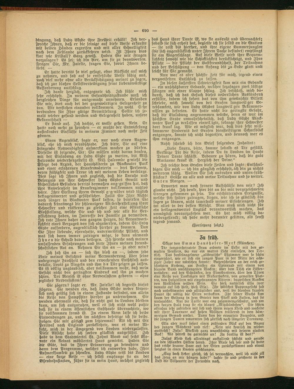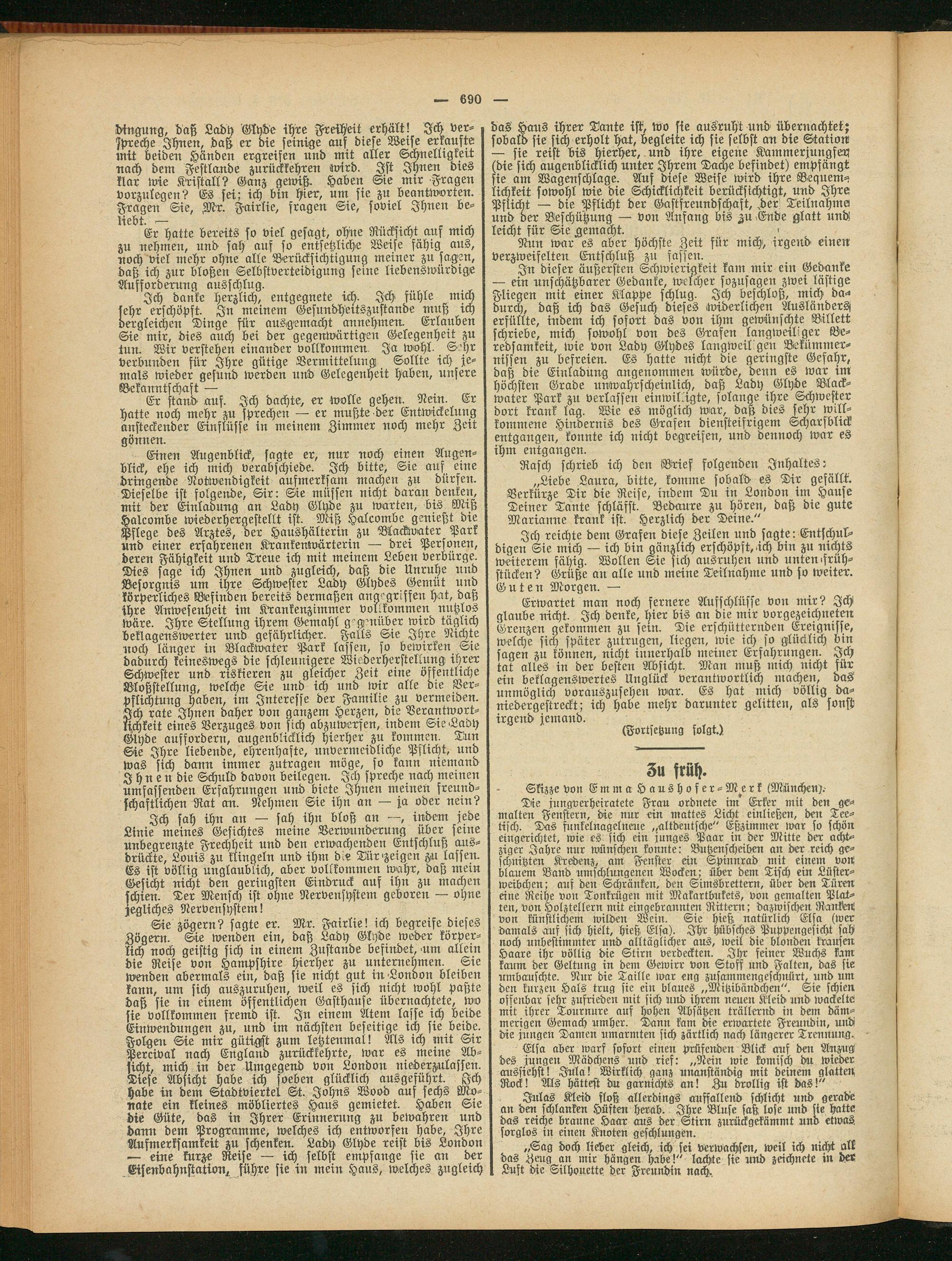 In dieser äußersten Schwierigkeit kam mir ein Gedanke — ein unschätzbarer Gedanke, welcher sozusagen zwei lästige Fliegen mit einer Klappe schlug. Ich beschloß, mich da-» durch, daß ich das Gesuch dieses widerlichen Ausländers, erfüllte, indem ich sofort das von ihm gewünschte Billett schriebe, mich sowohl von des Grafen langweiliger Beredsamkeit, wie von Lady Glydes langweilten Bekümmernissen zu befreien. Es hatte nicht die geringste Gefahr, daß die Einladung angenommen würde, denn es war im höchsten Grade unwahrscheinlich, daß Lady Glyde Blackwater Park zn verlassen einwil.igte, solange ihre Schwester dort krank lag. Wie es möglich war, daß dies sehr willkommene Hindernis des Grafen diensteifrigem Scharfblick entgangen, konnte ich nicht begreifen, und dennoch war es ihm entgangen.