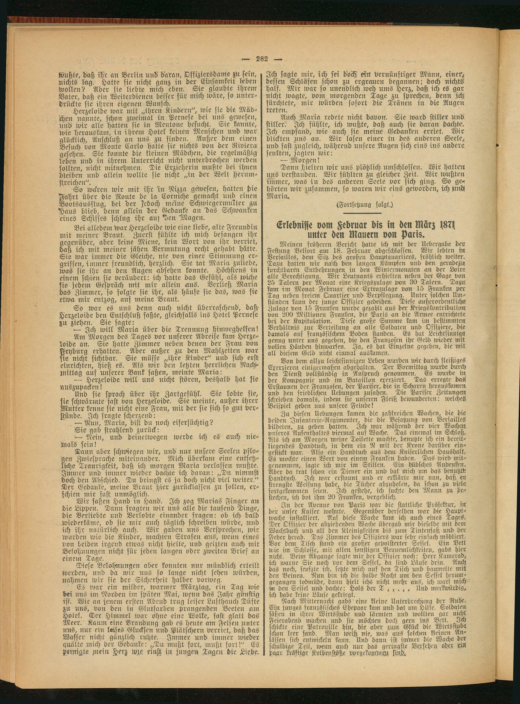 Meinen früheren Bericht hatte ich mitt der Ueb ergäbe der Festung Belfort am1 18. Februar abgeschlossen. Wir lebten in Versailles, dem Sitz des großen .Hauptquartiers, fröhlich weiter. Dazu hatten wir nach den langen Kämpfen und den geradezu furchtbaren Entbehrungen in den Winterm-onatcn an der Loire alle Berechtigung. Wir Leutnants erhielten neben der Gage von 25 Talern per Monat eine Kriegszulage von 30 Talern. Dazu kam im Monat Februar eine Extrazulage von 15 Franken per Tag neben freiem Quartier und Verpflegung. Unter solchen Umstünden kann der junge Offizier gedeihen. Diese außerordentliches Zulage von 15 Franken wurde gezahlt aus der Kriegskontributiost von 200 Millionen Franken, die Paris an die Armee entrichtete bei der Kapitulation. Diese große Summe kam im bestimmten Verhältnis zur Verteilung an alle Soldaten und Offiziere, die damals auf französischem Boden standen. Es hat Leichtsinnige! genug unter uns gegeben, die den Franzosen ihr Geld wieder mit vollen Händen hinwarfen. Ja, es hat Einzelne gegeben, die mit all diesem Geld nicht einmal auskamen.