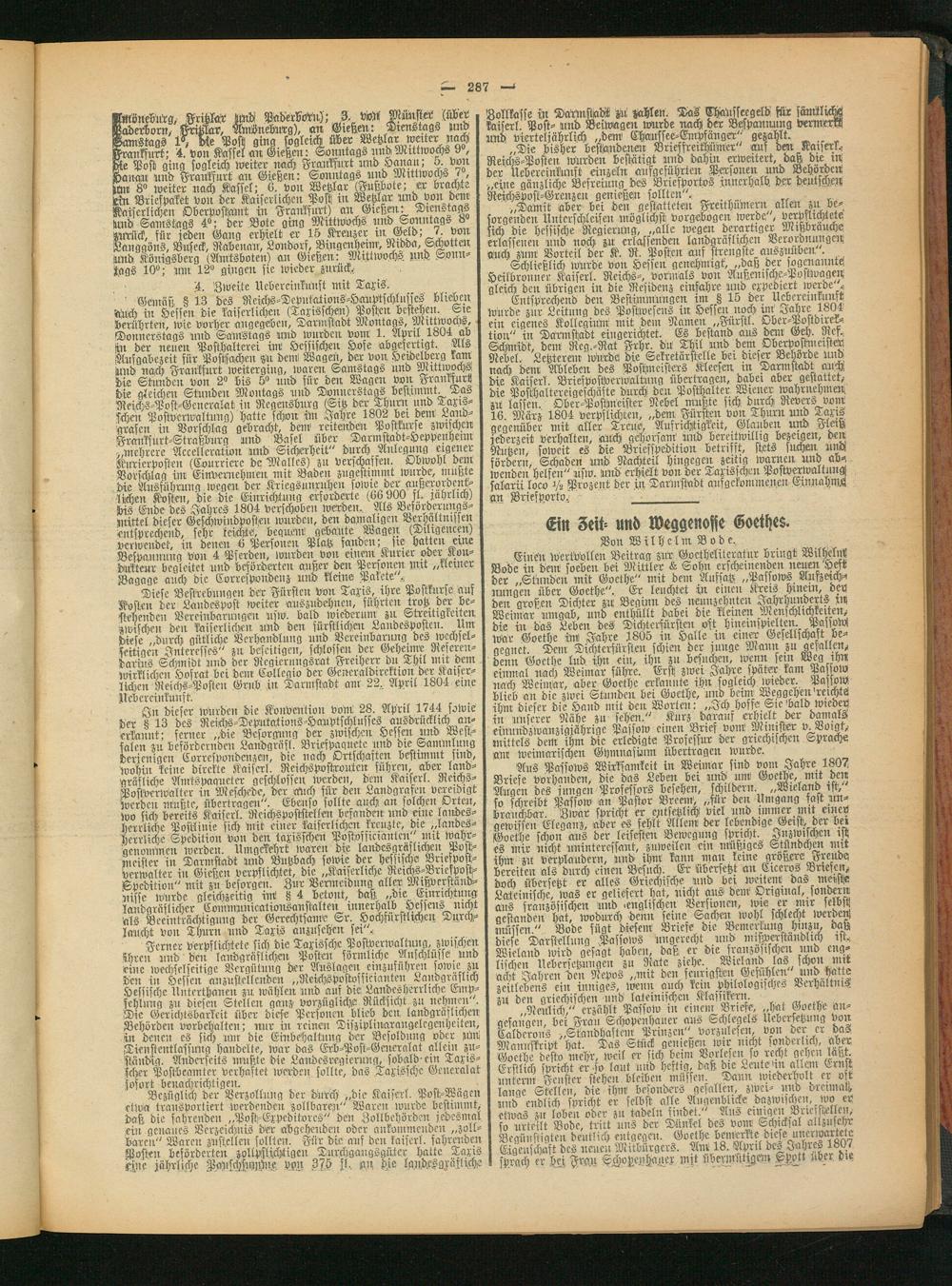 Einen Wertvollen Beitrag zur Goethelileratur bringt Wilhelm Bode in dem soeben bei Mittler & Sohn erscheinenden neuen Heft der „Stünden mit Goethe" mit dem Aufsatz „Passows Llufzeich?! uungeii über Goethe". Er leuchtet in einen Streid htnern, der, den großen Dichter zu Beginn des neunzehnten Jahrhunderts iN Weimar umgab, und enthüllt dabei die kleinenMenschlichkeiten, die in das Leben des Dichterfürsten oft htnetnsptelten, Passows war Goethe im Jahre 1805 in Halle.in enter Gesellschaft begegnet. Dem Dichterfürsten schien der imtgc Mann zu gefallen, denn Goethe lud ihn ein, ihn zu besuchen, wenn sein Weg ihn einmal nach Weimar führe. Erst zwei Jahre spater, kam Passow nach Weimar, aber Goethe erkannte ihn sogleich wieder. Passow blieb an die zwei Stunden bei Goethe, und beim Weggehen'reichte ihm dieser die Hand mit den Worten: „Jch.hofse Sie 'bald Wieders in unserer Nähe zu sehen," Kurz darauf erhielt der damals einundzwanzigjährige Passow einen Brief woM Minister v. Voigt, mittels dem ihm die erledigte; Professur der griechischen L-prache am weimarischen Gymnasium übertragen wurde.