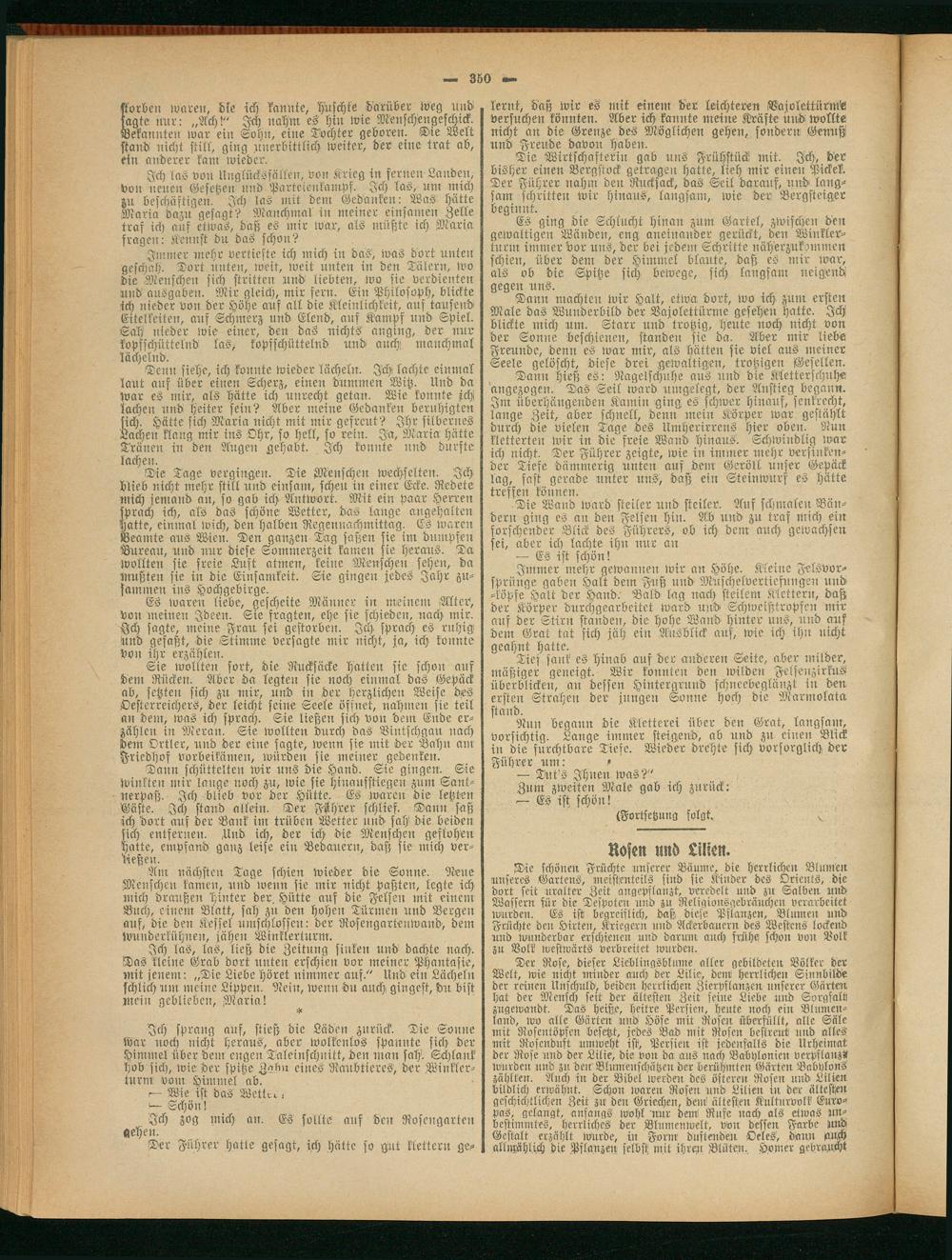 Der Rose, dieser Lieblingsblume aller gebildeten Völker der Welt, wie nicht minder auch der Lilie, den! herrlichen Sinnbilde der reinen Unschuld, beiden herrlichen Zierpflanzen unserer Gärten hat der Mensch seit der ältesten Zeit seine Liebe und Sorgsalti zugewandt. Das heiße, heitre Persien, heute noch ein Blumenland, lvo alle Garten und Höfe mit Rosen überfüllt, alle Säle mit Rosentöpfen besetzt, jedes Bad mit Rosen bestreut und alles mit Rosendust umweht ist, Persien ist jedenfalls die Urheimat der Rose und der Lilie, die von da aus nach Babylonien verpflanzt wurden, und zu den Blumenschätzen der berühmten Gärten Babylons zahlten. Auch in der Bibel werden des öfteren Rosen und Lilien bildlich erwähnt. Schon waren Rosen und Lilien in der ältesten geschichtlichen Zeit zu den Griechen, denk ältesten Kulturvolk Europas, gelangt, anfangs Wohl 'nur den! Rufe nach als etwas M- bestimmtes, herrliches der Blumenwelt, von dessen Farbe und Gestalt erzählt wurde, in Form duftenden Oeles, dann auch allmählich die Pflanzen selbst mit ihren .Blüten, Homer gebraucht