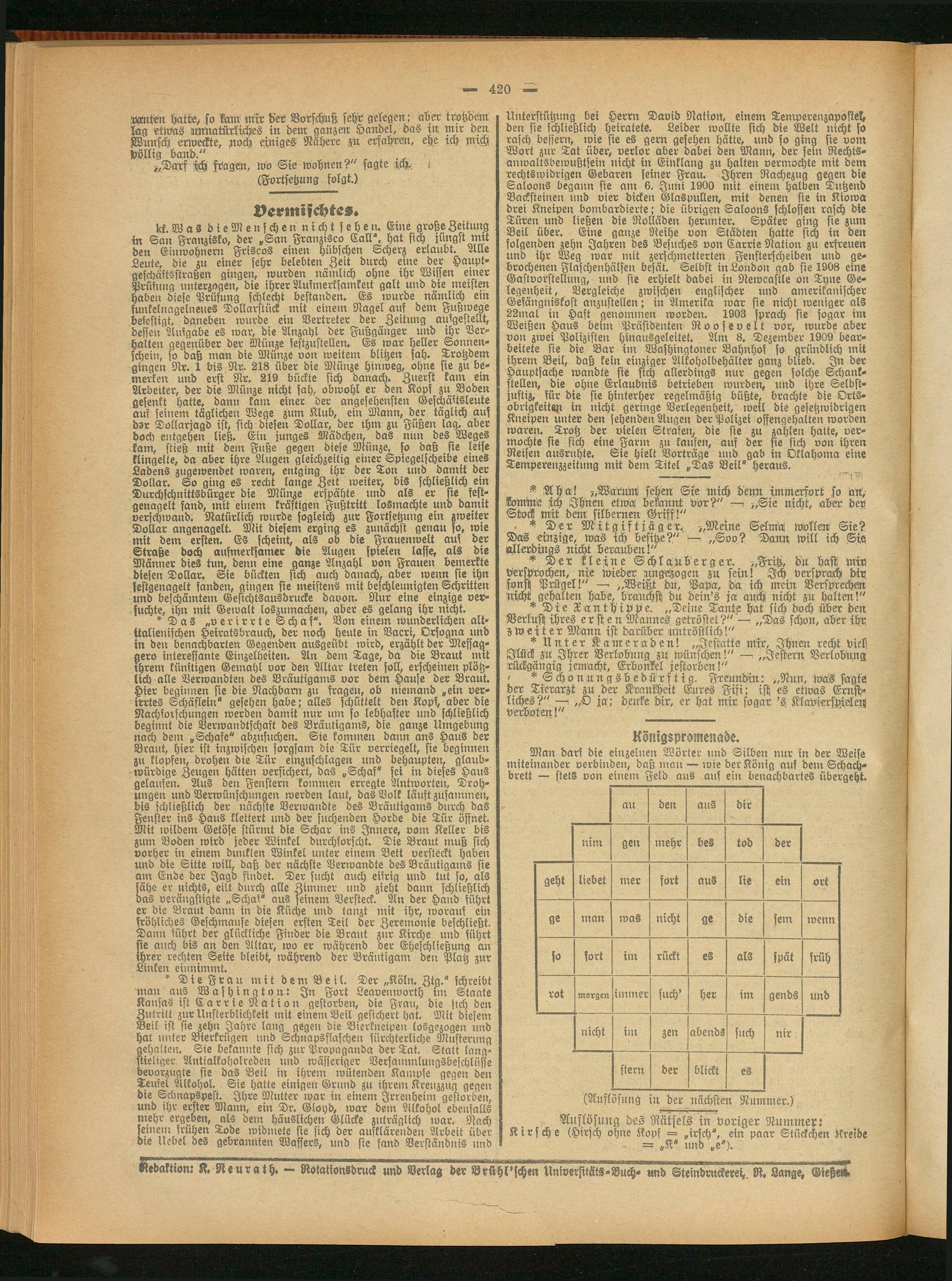 * Die Frau mit dem Beil. Der „Köln. Ztg." schreibt man aus Washington: In Fort Leavenworth int Staate Kansas ist Karrte Nation gestorben, die Frau, die sich den Zutritt zur Unsterblichkeit mit einem Beil gesichert hat. Mit diesem Beil ist sie zehn Jahre lang gegen die Bierkneipen losgezogen und hat unter Bierkrügen und Schnaps flaschen fürchterliche Musterung gehalten. Sie bekannte sich zur Propaganda der Tat. Statt langstieliger Antialkoholreden und wässeriger Versammlungsbeschlüsse bevorzugte sie das Beil in ihrem wütenden Kampfe gegen den Teufel Alkohol. Sie hatte einigen Grund zu ihrem Kreuzzug gegen die Schnapspest. Ihre Blutter war in einem Jrrenheim gestorben, und ihr erster Mann, ein Dr. Gloyd, war dem Alkohol ebenfalls mehr ergeben, als dem häuslichen Glücke zuträglich war. Nach seinem frühen Tode widmete sie sich der aufklärenden Arbeit über die Nebel des gebrannten Wassers, und sie fand Verständnis und