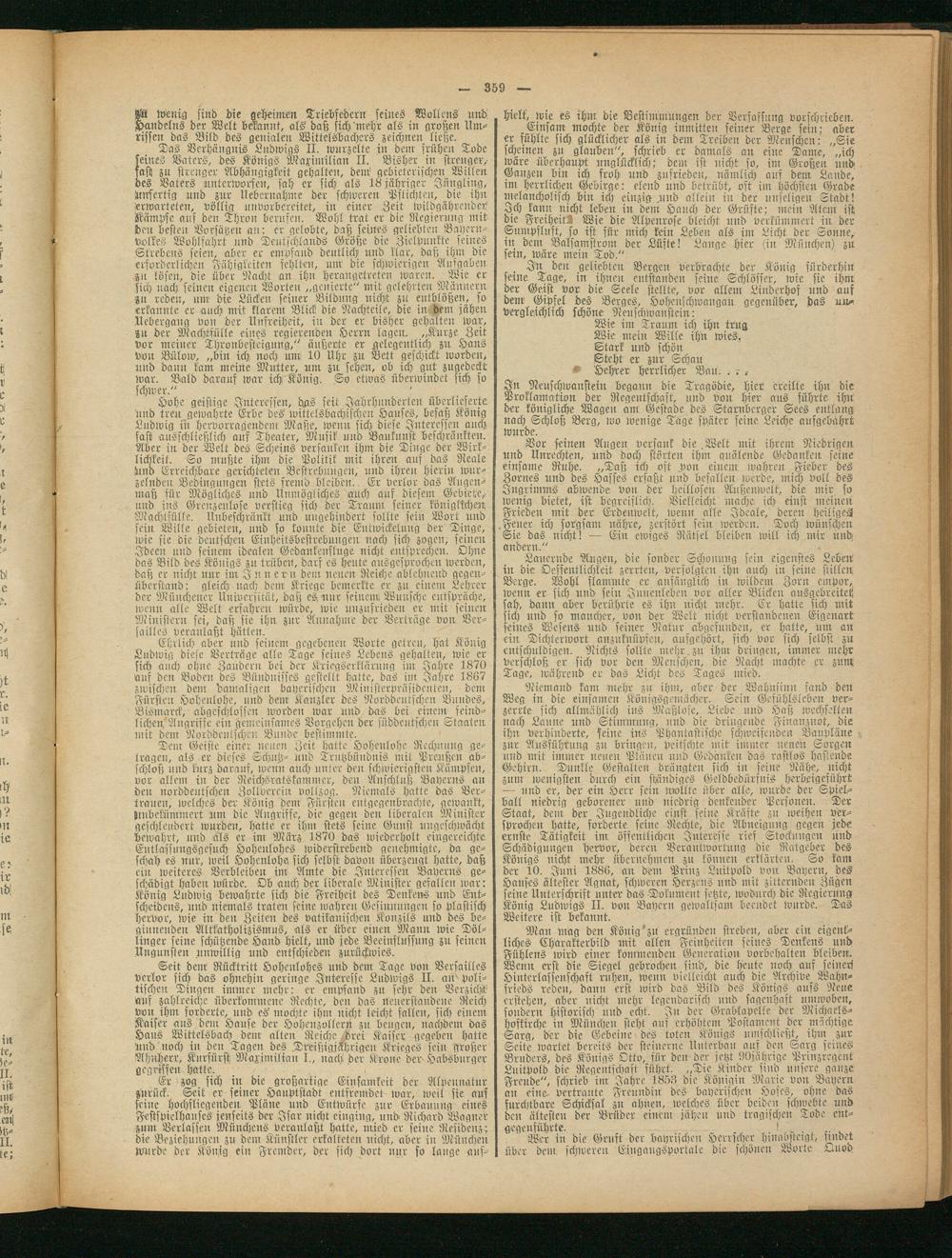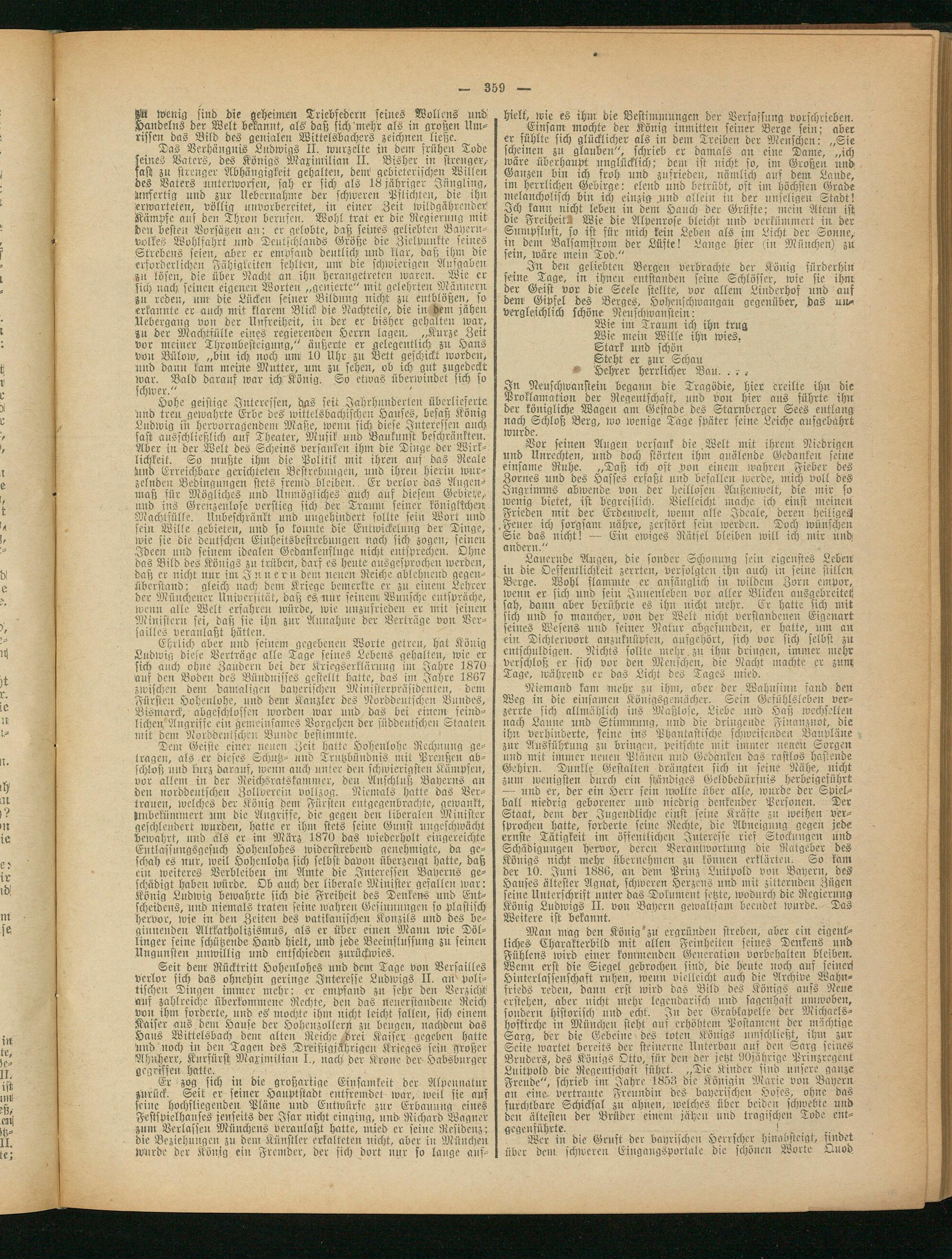 Er zog sich in die großartige Einsamkeit der Alpennatur zurück. Seit er feiner Hauptstadt entfremdet- wär, weil sie auf seine hochfliegenden Pläne und Entwürfe zur Erbauung eines Festspielhauses jenseits der Isar nicht entging, und Richard Wagner zum Verlassen Münchens veranlaßt hatte, mied er seine Residenz; die Beziehungen zu dem Künstler erkalteten nicht, aber in München wurde der König ein Fremder, der sich dort nur so lange anf-