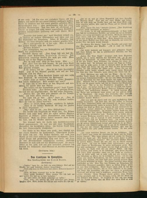 „Ich fürchte, sie ist recht unzusammenhängend: cs kann wohl sein, daß die verschiedenen Vorfälle, auf welche ich jetzt zu sprechen komme, sehr ivcnig miteiuaudcr zu tun haben. Gleich am allerersten! Tage führte mich Herr Rucastle an ein kleines Häuschen, das neben dem Eingang zur Küche steht. Beim Hinzutrcten vernahm ich das scharfe Rasseln einer Kette und ein Geräusch, wie wenn teilt großes Tier sich, darin herum bewegte.
