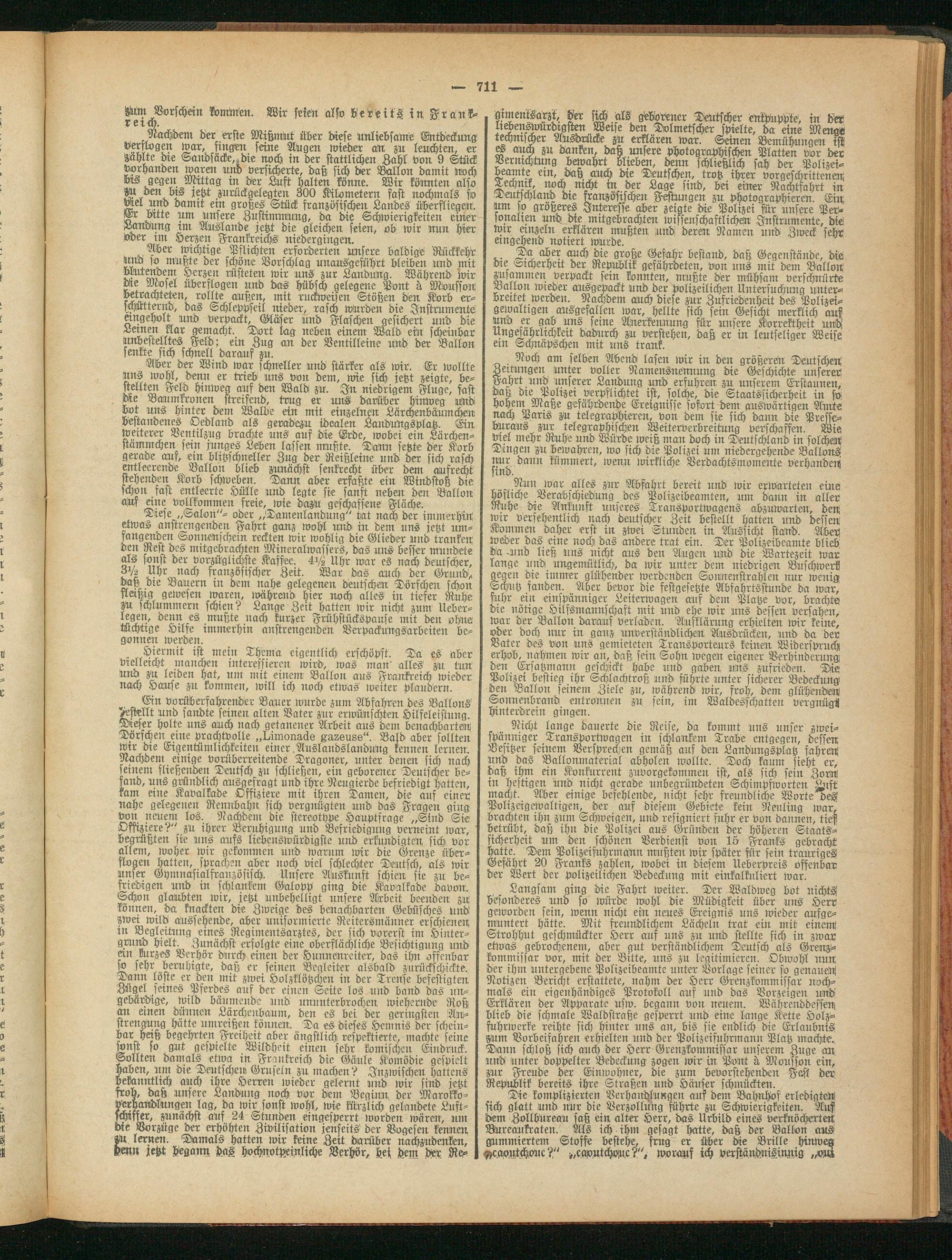 Roch am selben Abend lasen wir in den größeren Deutschen! Zeitungen unter voller Namensnennung die Geschichte unserer! Fahrt.und unserer Landung und erfuhren zu unserem Erstaunen, daß die Polizei verpflichtet ist, solche, die Staatssicherheit in so hohem Maße gefährdende Ereignisse sofort dem auswärtigen Amte nach Paris zu telegraphieren, von dem sie sich dann die Presse- buraus zur telegraphischen Weiterverbreitung verschaffen. Wie Mel mehr Ruhe und Würde weiß man doch in Deutschland in solchen Dingen zu bewahren, wo sich die Polizei um niedergehende Ballons nur dann kümmert, iuen.it wirkliche Verdachtsmomente verhanden sind.