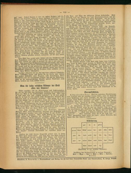 Schier unzählig sind die Mitteilungen und Zahlenaitgaben, die mit der Zeit über den fabelhaften Reichtum der vermögendsten Leute der Welt in die Oeffentlichkeit gedrungen sind. Aber mag e§ auch wahr sein, daß „Zahlen beweisen", so ist doch gewiß, daß sie, so bald sie eine gewisse Höhe überschreiten, keinerlei Anschauung mehr zu vermitteln vermögen. Und darum ist es als eine sehr lnibsche Idee zu bezeichnen, wenn eme englische Monatsschrift der „Strand", in ihreni neusten Hefte den Versuch macht, eine wirkliche Anschauung von der ungeheuerlichen Geldansammlung in der Hand der größten Krösusse unserer Zeit zu geben, indem er die Frage stellt: Was könnten denn eigentlich die sechs reichsten Männer der Welt mit ihrem Gelde alles ausrichten?