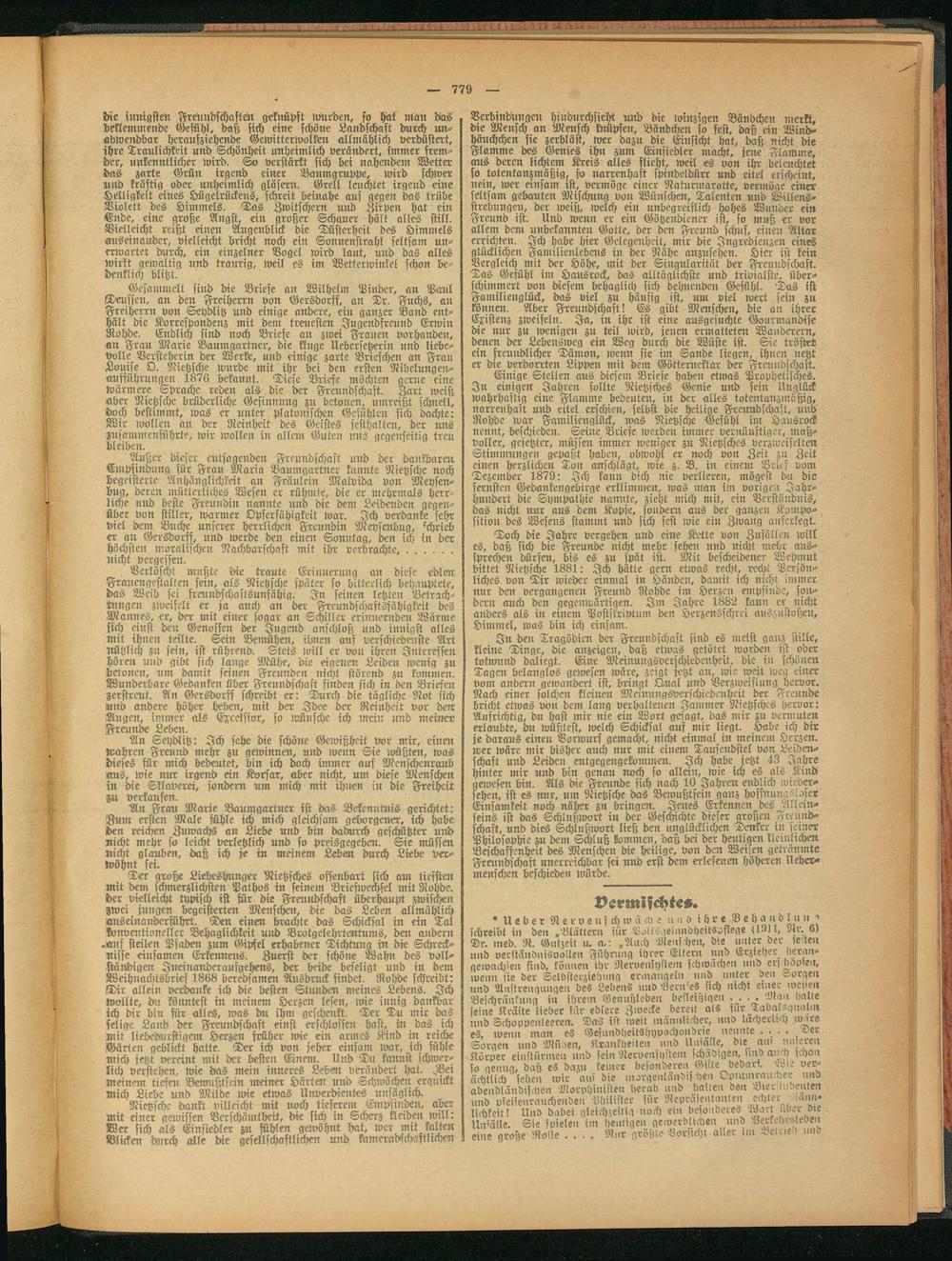 Gesammelt sind die Briefe an Wilhelm Pinder, an Paul Drussen, an den Freiherrn van Gersdorff, an Tr. Fuchs, an Freiherrn von Seydlitz und einige andere, ei» ganzer Band enthält die Korrespondenz mit dem treuesten Jugendfreund Erwin Rohde. Endlich sind noch Briefe an zwei Frauen vorhanden, an Frau Marie Baumgartner, die finge Uebersetzerin und liebevolle, Vcrsteherin der Werke, und einige zarte Briefchen an Frau Louise O. Nietzsche wurde mit ihr bei den ersten Nibelungen- aufführungen 1876 bekannt. Diese Briefe möchten gerne eine wärmere Sprache reden als die der Freundschaft. Zart weiß aber Nietzsche brüderliche Gesinnung zu betonen, umreißt schnell, doch bestimmt, was er unter platonischen Gefühlen sich dachte: Wir wollen an der Reinheit des Geistes festhalten, der uns zusamnrenführte, wir wollen in allein Guten uns gegenseitig treu bleiben.