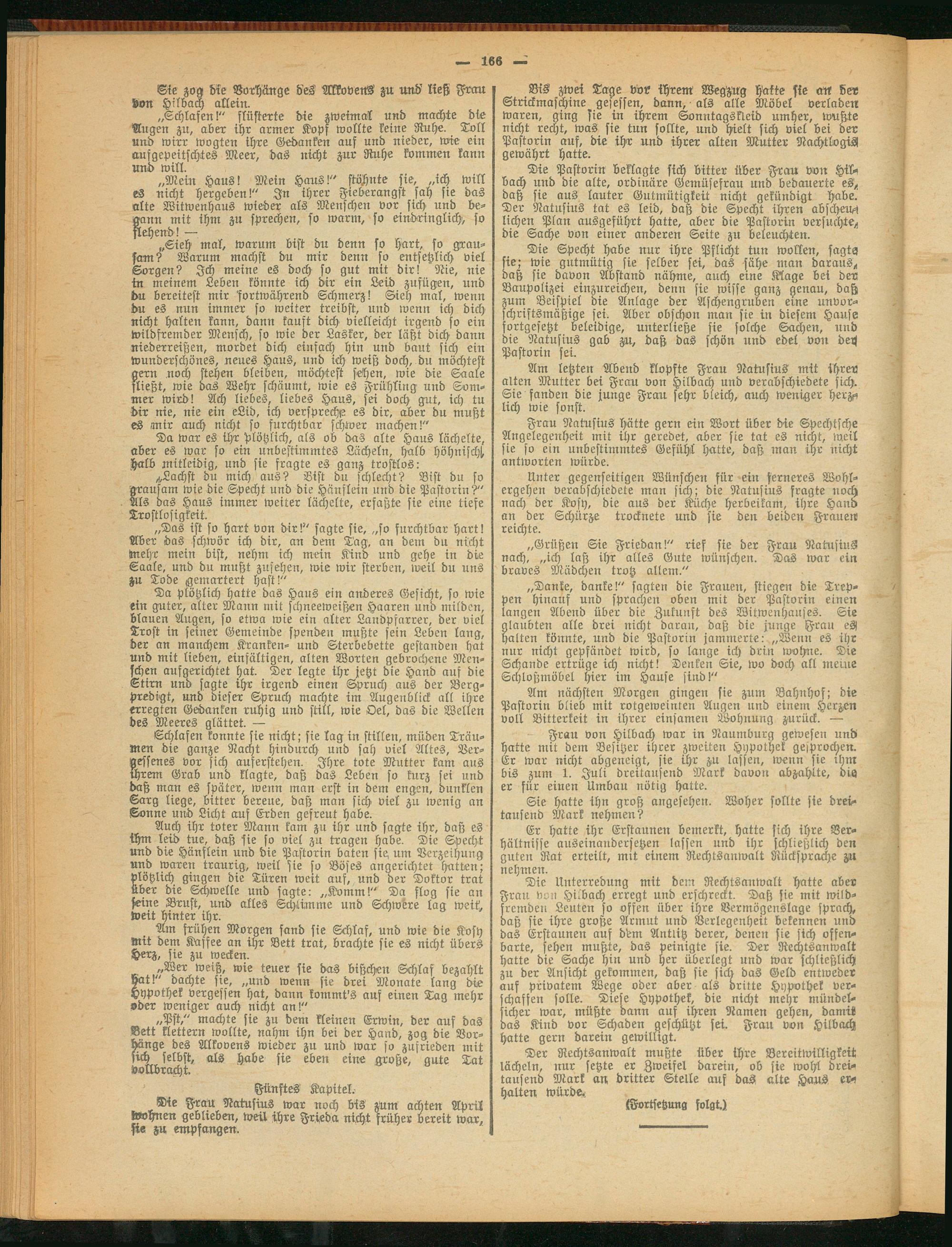 „Mein Haus! Mein Haus!" stöhnte sie, „ich will es nicht hergeben!" In ihrer Fieberangst sah sie das alte Witwenhaus wieder als Menschen vor sich und begann mit ihm zu sprechen, so warm, so eindringlich, so flehend! —