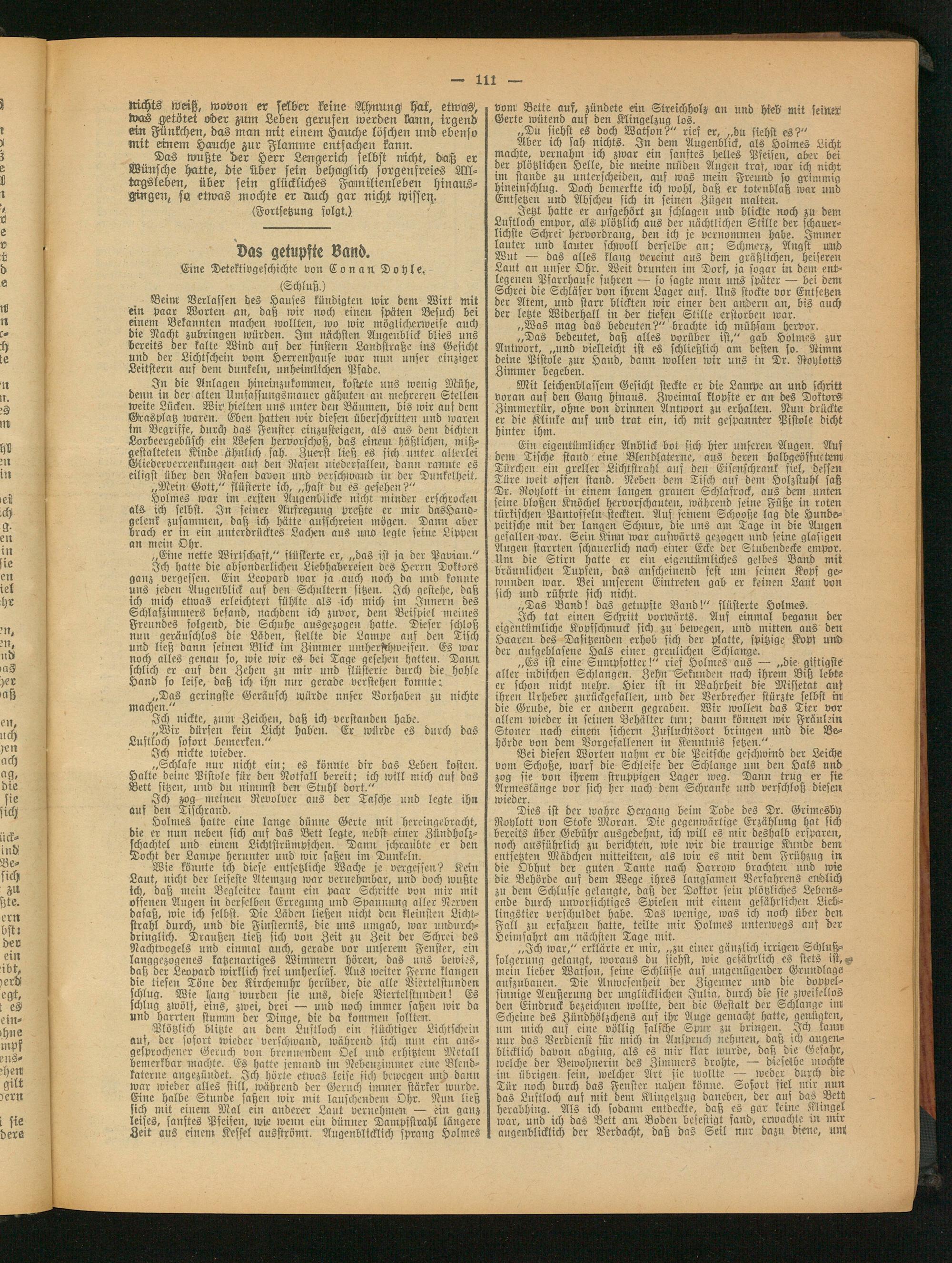Dies ist der wahre Hergang beim Tode des Dr. Grimesby Roylott von ©tote Moran. Die gegenwärtige Erzählung hat sich bereits über Gebühr ausgedehnt, ich will es mir deshalb ersparen, noch ausführlich zu berichten, tote wir die traurige Künde dem entfetten Mädchen mitteilten, als wir es mit dem Frühzug in die Obhut der guten Tante nach Harroto brachten und tote die Behörde auf dem Wege ihres langsamen Verfahrens endlich zu dem Schlüsse gelangte, daß der Doktor fein plötzliches Lebensende durch unvorsichtiges Spielen mit einem gefährlichen Liebl- lingstier verschuldet habe. Das wenige, was ich noch über den Fall zu erfahren hatte, teilte mir Holmes unterwegs aus her Heimfahrt am nächsten Tage mit.
