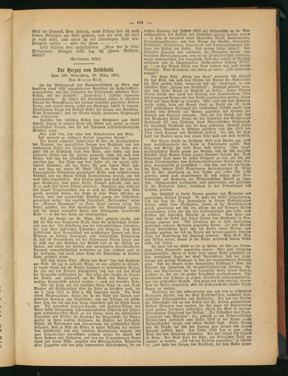 So hatte sich der Enkel an die zu halten, die ihm zur Förderung seiner Kenntnisse zugewiesen waren. Aber zum Jüngling herangewachsen, scheint er lieber seine eigene Bahn gewandelt zu fein, wenigstens klagte der Gras Dietrichstein, daß der junge Herzog nur geringe Ausdauer in den ihm vorgezeichneten Studien zeige. Und der Grund dieser mangelnden Ansdauer? Nun, die Vorliebe des Jünglings für kriegswissenschastliche Studien. Erfüllt von Begeisterung für das strategische Genie seines Vaters, trachtete er, ihm als ein großer Kriegsheld gleichzukommen. Für Frankreich das Eckiwert zu ziehen, Frankreich wiederzugewinnen, war sein glühendster Wunsch. Und wenn das nicht angurge, wemg- stens für Polen einzutreten, oder für Oesterreich ein zweiter Ritter Eugen zu werden. 1 1 c „ „ . , „