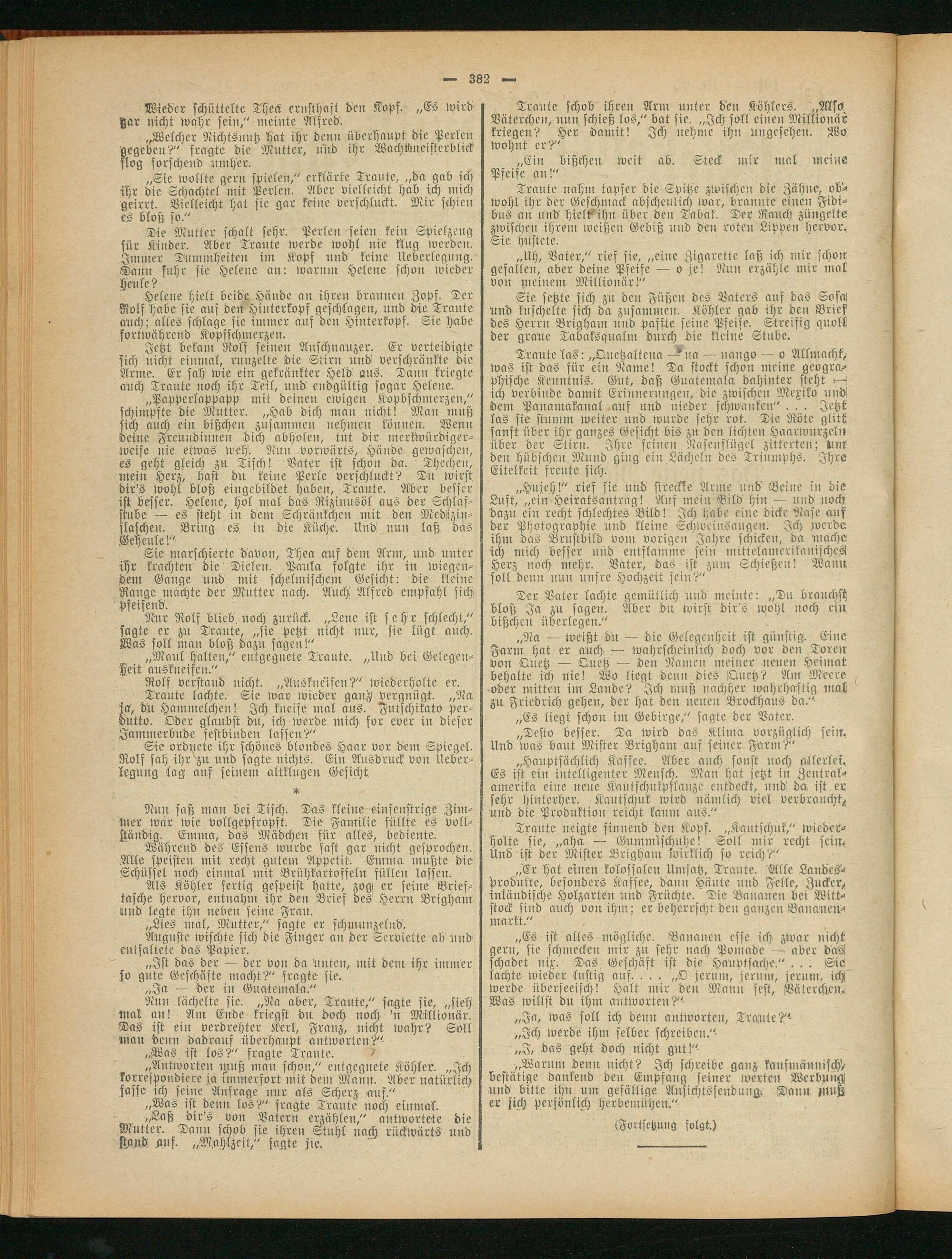 „Ra — weißt du — die Gelegenheit ist günstig. Eine Farm hat er auch —■ wahrscheinlich doch vor den Torrn von Quetz — Quetz — den Namen meiner neuen Heimat behalte ich nie! Wo liegt denn Pies 'Quetz? Am Meere oder mitten int Lande? Ich muß nachher wahrhaftig mali zu Friedrich gehen, der hat den neuen Brockhaus bei."-