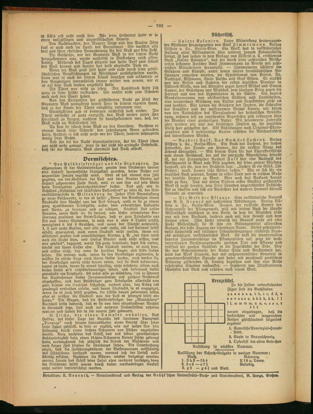 Redaktion: K. Neurath. — Rotationsdruck und Verlag der Brühl'schen Universitäts-Buch- und Steindruckerei, R. Lang«, Gießen.