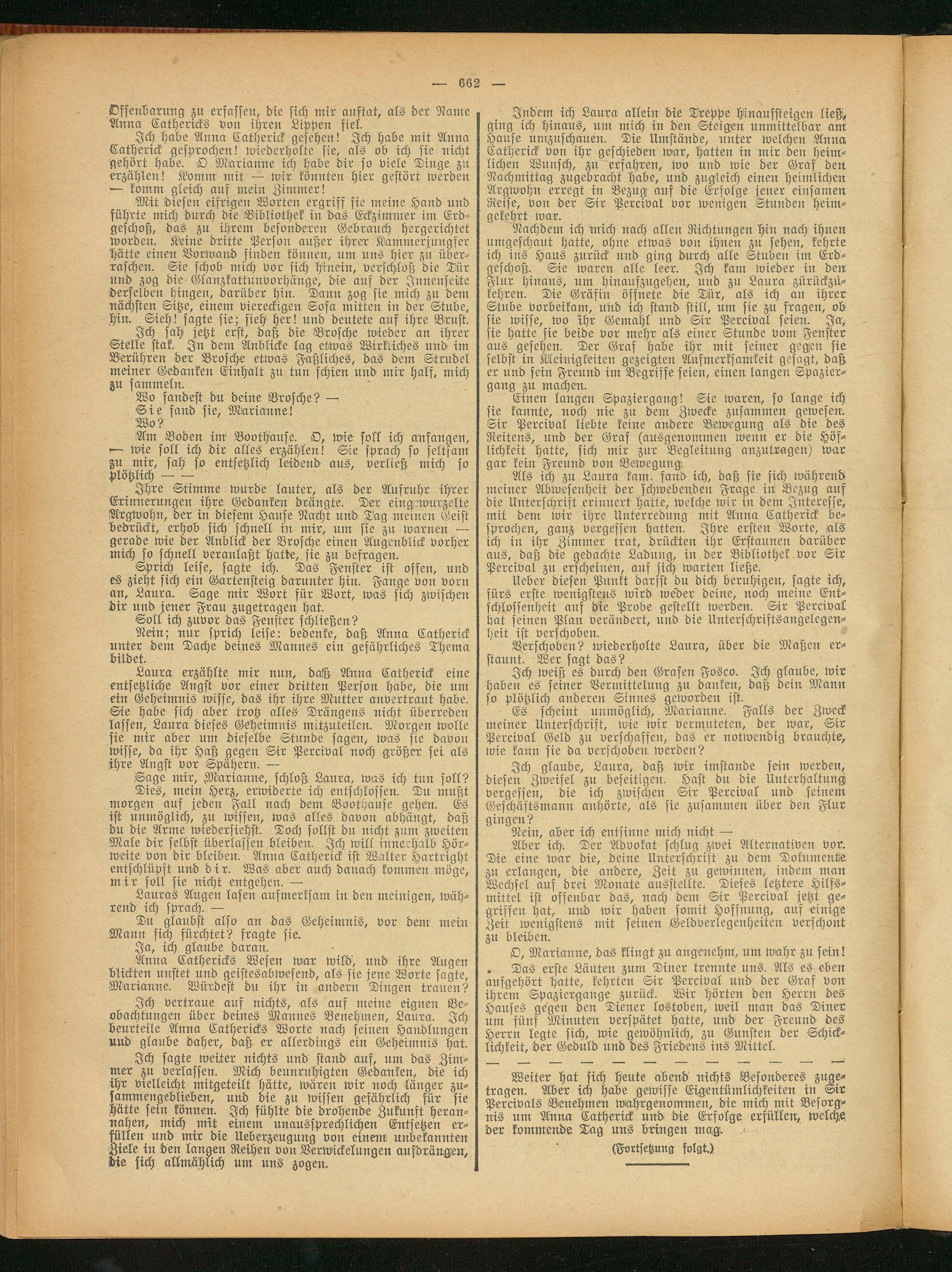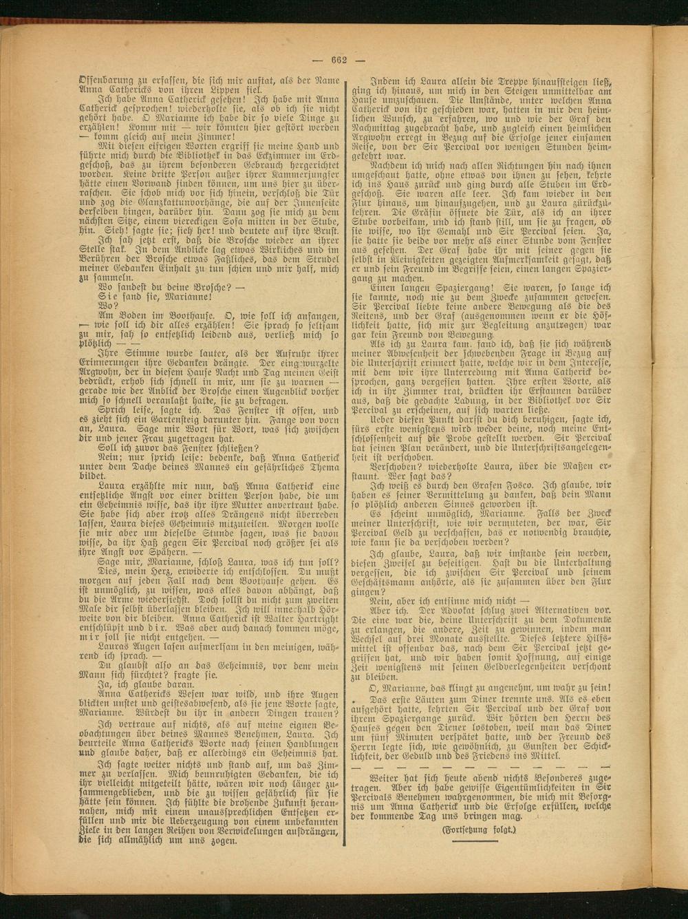 Dies, mein Herz, erwiderte ich entschlossen. Du mußt morgen auf jeden Fall nach dem Boothause gehen. Es ist unmöglich, zu wissen, was alles davon abhängt, daß du die Arme wiedersiehst. Doch sollst du nicht zunt zweiten Male dir selbst überlassen bleiben. Ich will innerhalb Hörweite von dir bleiben. Anna Catherick ist Walter Hartright entschlüpft und dir. Was aber auch danach kommen möge, mir soll sie nicht entgehen. —