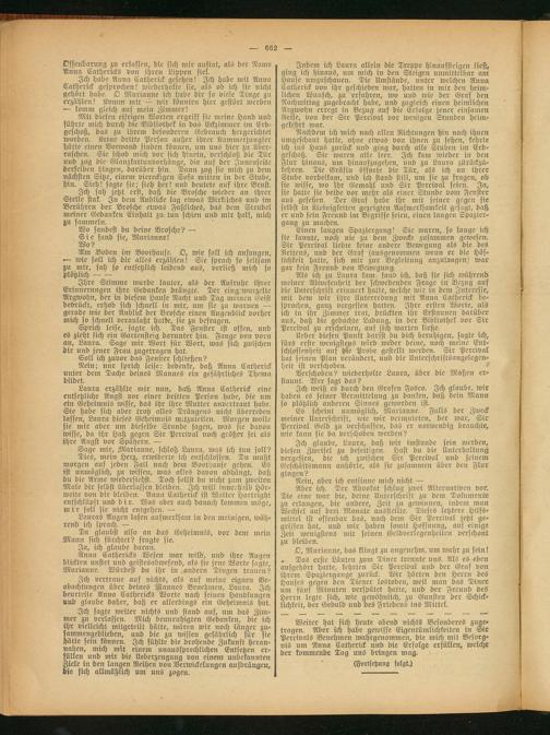 Mit diesen eifrigen Worten ergriff sie meine Hand und führte mich durch die Bibliothek in das Eckzimmer im Erdgeschoß, das zu ihrem besonderen Gebrauch hergerichtet worden. Keine dritte Person außer ihrer Kammerjungfer hatte einen Vorwand finden können, um uus hier zu überraschen. Sie schob niich vor sich hinein, verschloß die Tür und zog die Glanzkattunvorhänge, die auf der Innenseite derselben hingen, darüber hin. Dann zog sie mich zu dem nächsten Sitze, einem viereckigen Sofa mitten in der Stube, hin. Sieh! sagte sie; sieh her! und deutete auf ihre Brust.