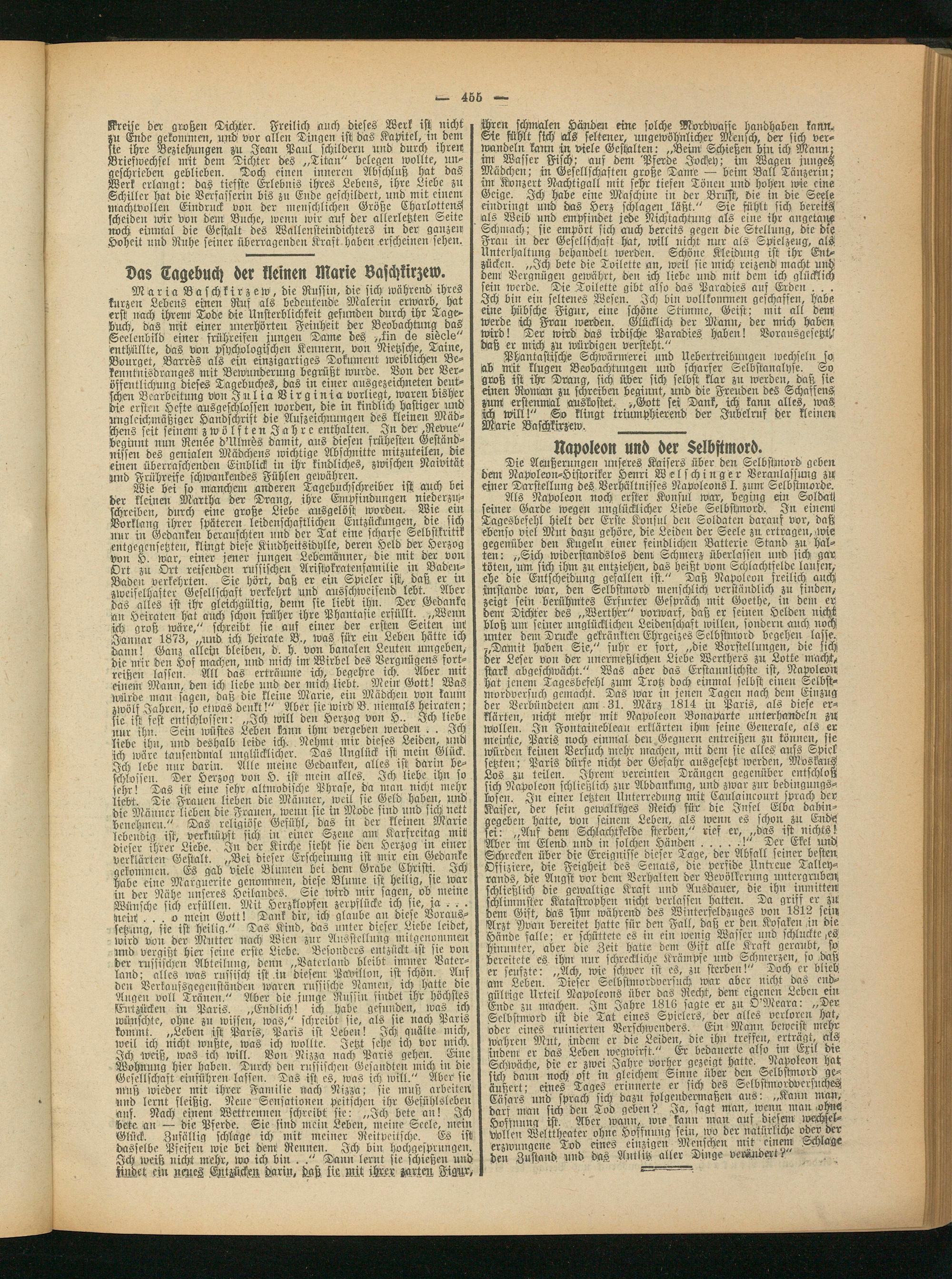 M a r i a B a s ch k i r z e w, die Russin, die sich während ihres kurzen Lebens einen Ruf als bedeutende Malerin erwarb, hat erst Nach Wem Todd die Unsterblichkeit gefunden durch ihr Tage- huch, das mit einer unerhörten Feinheit der Beobachtung das Seelenbild einer frühreifen jungen DaMe des >,fin de siecle' enthüllte, das von psychologischen Kennern, von Nietzsche, Tarne, Bourget, Barres als ein einzigartiges Dokument weiblichen Bekenntnisdranges mit Bewunderung begrüßt wurde. Bon der Veröffentlichung dieses Tagebuches, das in einer ausgezeichneten deutschen Bearbeitung titelt Julia Virginia vorliegt, waren bisher die ersten Hefte ausgeschlossen worden, die in kindliche hastiger und ungleichmäßiger Handschrist die Aufzeichnungen des kleinen Mädchens feit seinem zwölften Jahre enthalten., Ju der ,Revue beginnt nun Re-noe d'UlMös damit, aus diesen frühesten Geständnissen des genialen Mädchens wichtige Abschnitte mitzuteilen, dre einen überraschenden Einblick in ihr kindliches, zwischen Naivität Und Frühreife schwankendes Fühlen gewähren.