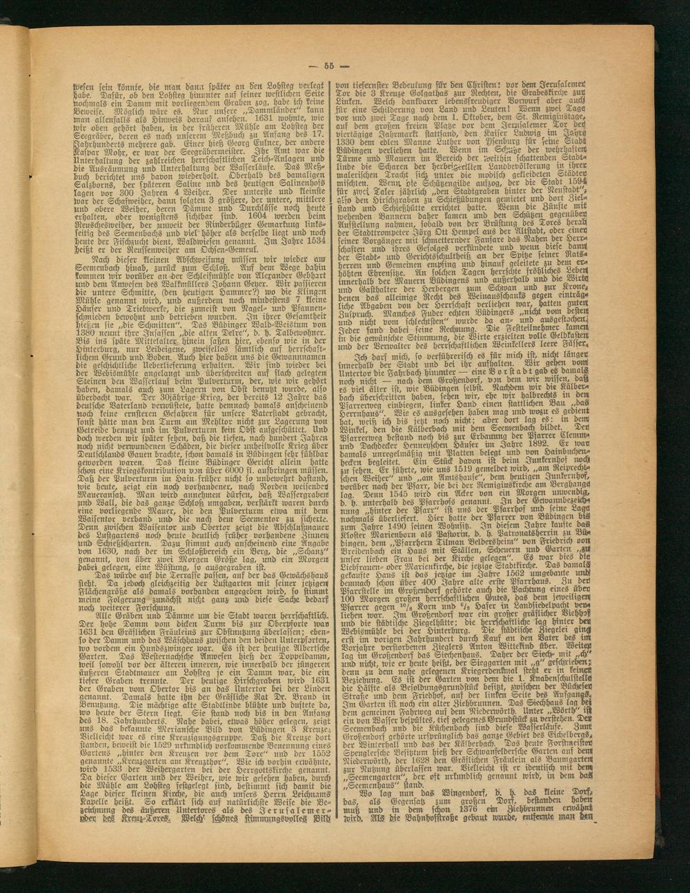 Wesen sein Tonnfe, die man dann spater an den Lohsteg' verlegt habe. Dafür, ob den Lohsteg hinunter auf seiner westlichen Seite Nochmals ein Damm mit vorliegendem Graben zog, habe im reine Beweise. Möglich wäre es. Nur unsere „Dammländer" kann Man allenfalls als Hinweis darauf ansehen. 1631 wohnte, tote wir oben gehört haben, in der früheren Mühle am Lohsteg der Seegräber, deren es nach unserenr Meßbuch zu Anfang des 17. Jahrhunderts mehrere gab. Einer hieß Georg Eulner, der andere Kaspar Mohr, er war der Seegräbermeister. Ihr Amt war die Unterhaltung der zahlreichen herrschaftlichen Teich-Anlagen und die Ausräumung und Unterhaltung der Wasserlaufe. Das Meßbuch berichtet uns davon wiederholt. Oberhalb des damaligen Salzborns, der späteren Saline und des heutigen Salinenhofs lagen vor 300 Jahren 4 Weiher. Der unterste und kleinste Mar der Schafweihcr, dann folgten 3 größere, der untere, mittlere Und obere Weiher, deren Dämme und Durchlässe noch heute erhalten, oder wenigstens sichtbar sind. 1604 werden beim Neuschesweiher, der unweit der Rinderbüger Gemarkung linksseitig des Seemenbachs und viel höher als derselbe liegt und noch heute der Fischzucht dient, Waldwiesen genannt. Im Jahre 1534 heißt er der Reussenweiher am Ochsen-Gemeul.
