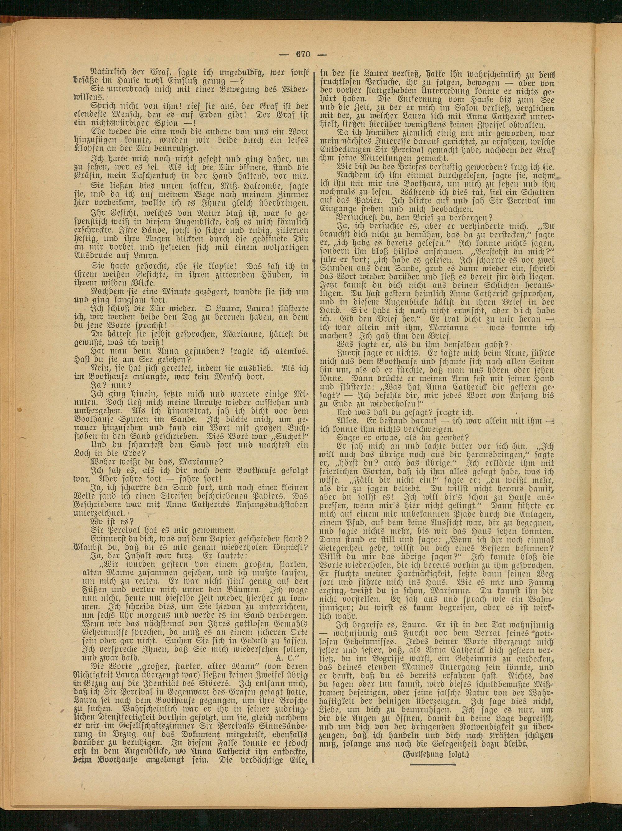 Die Worte „großer, starker, alter Mann" (von deren Richtigkeit Laura überzeugt war) ließen keinen Zweifel übrig in Bezug auf die Identität des Störers. Ich entsann mich, daß ich Sir Percival in Gegenwart des Grafen gesagt hatte, Laura sei nach dem Boothause gegangen, um ihre Brosche zu suchen. Wahrscheinlich war er ihr in seiner zudring- lichen Dicnstfertigkeit dorthin gefolgt, um sie, gleich nachdem er mir im Gesellschaftszimmer Sir Percivals Sinnesände- rung in Bezug auf das Dokument mitgeteilt, ebenfalls darüber zu beruhigen. In diesem Falle konnte er jedoch erst in dem Augenblicke, wo Anna Catherick ihn entdeckte, beim Boothause angelangt sein. Die verdächtige Eile,