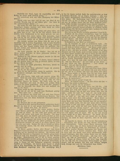 Er sah mich an und lachte bitter vor sich hin. „Ich will auch das übrige noch aus dir herausbringen," sagte er, „hörst du? auch das übrige." Ich erklärte ihm mit feierlichen Worten, daß ich ihm alles gesagt habe, was ich wisse. „Fällt dir nicht ein!" sagte er; „du weißt mehr, als dir zu sagen beliebt. Du willst nicht heraus bamit, aber du sollst es! Ich 'will dir's schon zu Hause auspressen, wenn mir's hier nicht gelingt." Dann führte er mich auf einem mir unbekannten Pfade durch die Anlagen, einem Pfad, auf dem keine Aussicht war, dir zu begegnen, und sagte nichts mehr, bis wir das Haus sehen konnten. Dann stand er still und sagte: „Wenn ich dir noch einmal Gelegenheit gebe, willst du dich eines Bessern besinnen? Willst du mir das übrige sagen?" Ich konnte bloß die Worte wiederholen, die ich bereits vorhin zu ihm gesprochen. Er fluchte meiner Hartnäckigkeit, setzte dann seinen Weg fort und führte mich ins Haus. Wie es mir und Fannh erging, weißt du ja schon, Marianne. Du kannst ihn dir nicht vorstellen. Er. sah aus und sprach wie ein Wahn- sinniger; du wirst es kaum begreisen, aber es ist wirklich wahr.