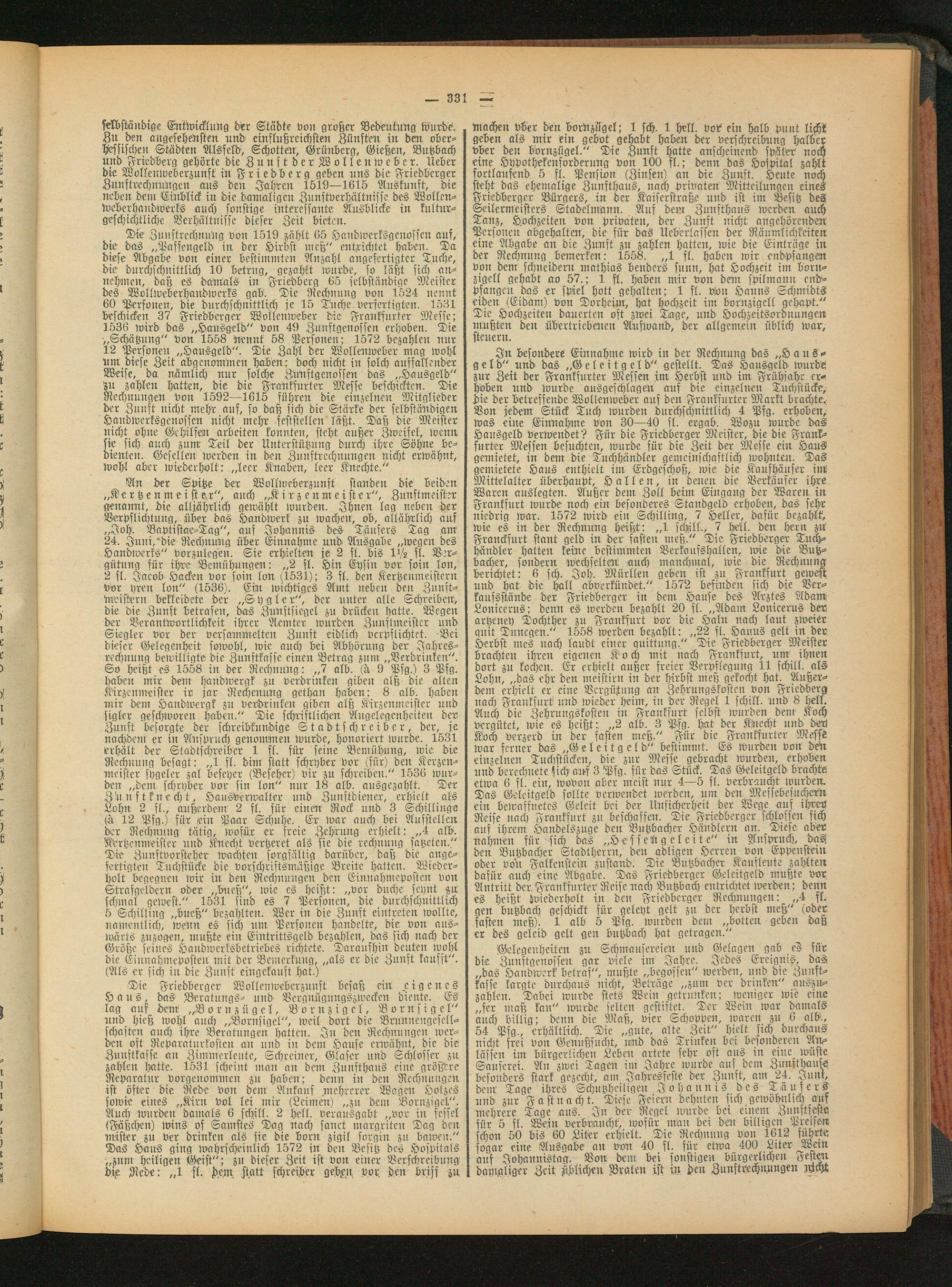 selbständige Entwicklung der Städte von großer Bedeutung wurde. Zu den angesehensten unb- einflußreichsten Zünften in den oberhessischen Städten Alsfeld, Schotten, Grünberg, Gießen, Butzbach und Friedberg gehörte die Z u n s t d c r W o l l e n w c b c r. lieber die Wollemveberzunft in Friedberg geben uns die Friedberger Zunftrechnungen aus den Jahren 1519—1615 Auskunft, die neben dein Einblick in die damaligen Zunftverhältnisse des Wollen- weberhandtverks auch sonstige interessante Ausblicke in kulturgeschichtliche Verhältnisse dieser Zeit bieten.