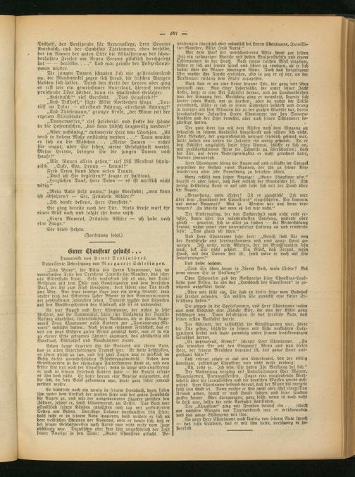 Er blätterte noch ein wenig in seinem .Handbuch, dann fielen ihm Unter dem Einfluß der großen Hitze und des guten Frühstücks dje Augen zu, und mit der ausgebrannten Zigarre zwischen den Zähnen, .lehnte er, sanft schlummernd, im Sessel. Tas Buch war .allmählich seinen Händen entglitten und lag mit zerknitterten Seiten am Boden. Unruhige Träume durchzuckten sein Hirn; bald fuhr er in feinem Auto spazieren, bald weidete er sich an deut neidischen Stiauuen der Rosnays, oder er freute sich, daß er bei seinen Geschäftsreisen nach Paris nun nicht mehr vom Zuge übhängig war. Dazwischen aber kam ihm unaufhörlich der Text seiner Anzeige in den Sinn: „Guter .Chauffeur gesucht. Be
