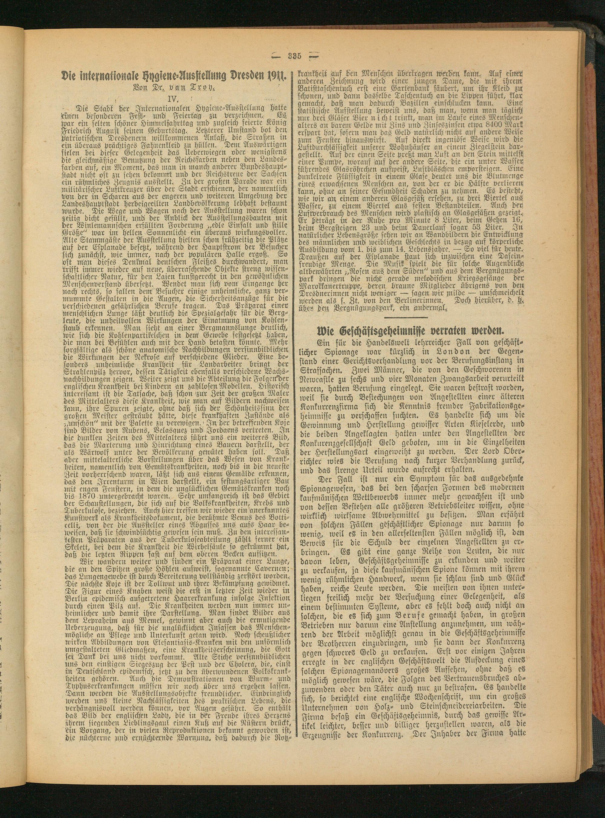 Ein für die Handelswelt lehrreicher Fall von geschäftlicher Spionage war kürzlich in London der Gegenstand einer Gerichtsverhandlung vor der Berufungsinstanz in Strafsachen. Zwei Männer, die von den Geschworenen in Newcastle zu sechs und vier Monaten Zwangsarbeit verurteilt waren, hatten Berufung eingelegt. Sie waren bestraft worden, weil sie durch Bestechungen von Angestellten einer älteren Konkurrenzfirma sich die Kenntnis fremder Fabrikationsgeheimnisse zu verschaffen suchten. Es handelte sich um die Gewinnung und Herstellung gewisser Arten Kieselerde, und die beiden Angeklagten hatten unter den Angestellten der Konkurenzgesellschaft Geld geboten, um in die Einzelheiten der Herstellungsart eiugeweiht zu werden. Der Lord Oberrichter wies die Berufung nach kurzer Verhandlung zurück, und das strenge Urteil wurde aufrecht erhalten.