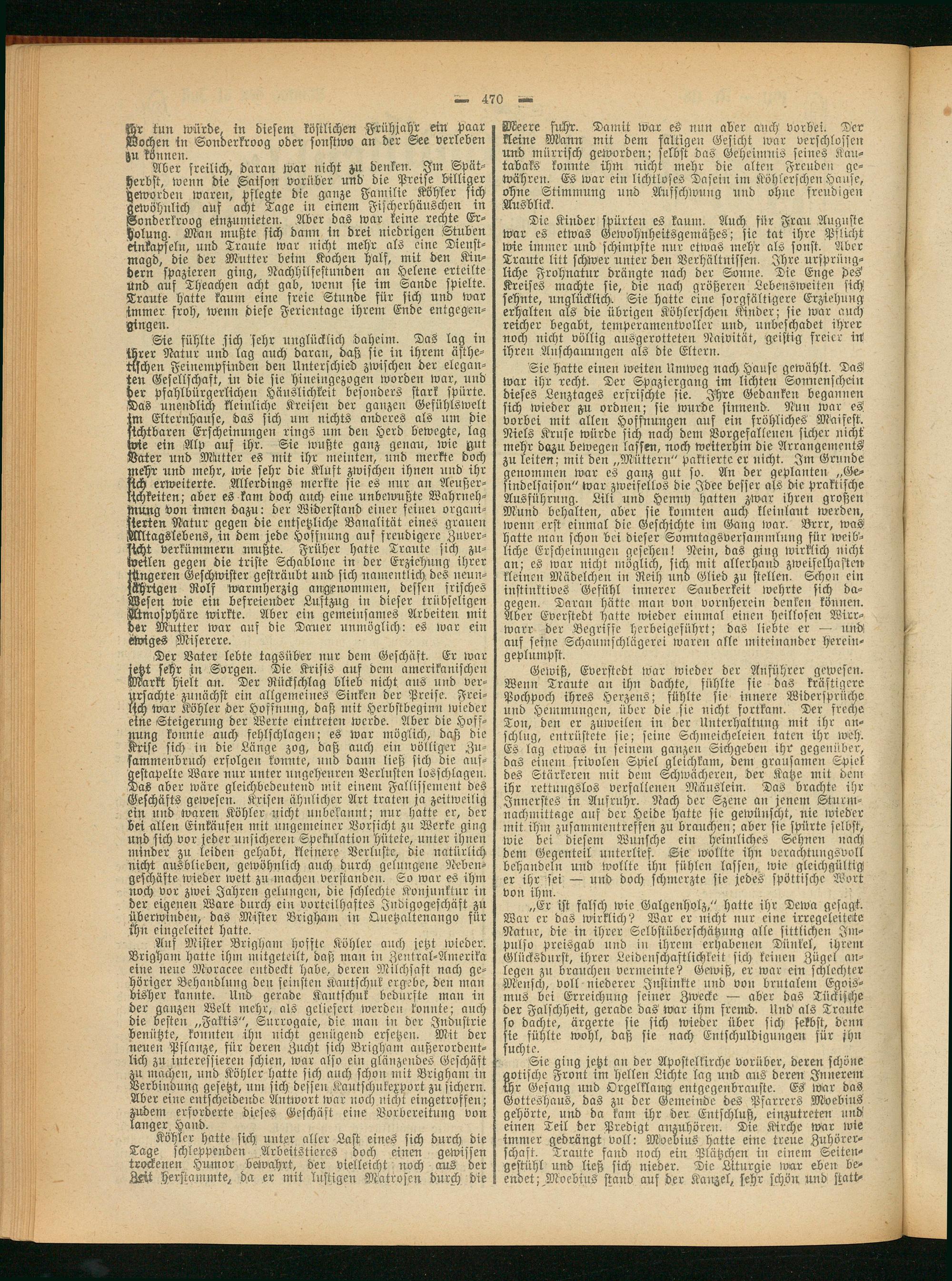 Die Kinder spürten es kaum. Auch für Frau Auguste war es etwas Gewohnheitsgemäßes; sie tat ihre Pflicht wie immer und schimpfte nur etwas mehr als sonst. Aber Trante litt schwer unter den Verhältnissen. Ihre ursprüngliche Frohnatur drängte nach der Sonne. Die Enge pes Kreises machte sie, die nach größeren Lebensweiten sich! sehnte, unglücklich. Sie hatte eine sorgfältigere Erziehung erhalten als die übrigen Köhlerschen Kinder; sie war auch reicher begabt, temperamentvoller und, unbeschadet ihrer noch nicht völlig ausgerotteten Naivität, geistig freier in! ihren Anschauungen als die Eltern.