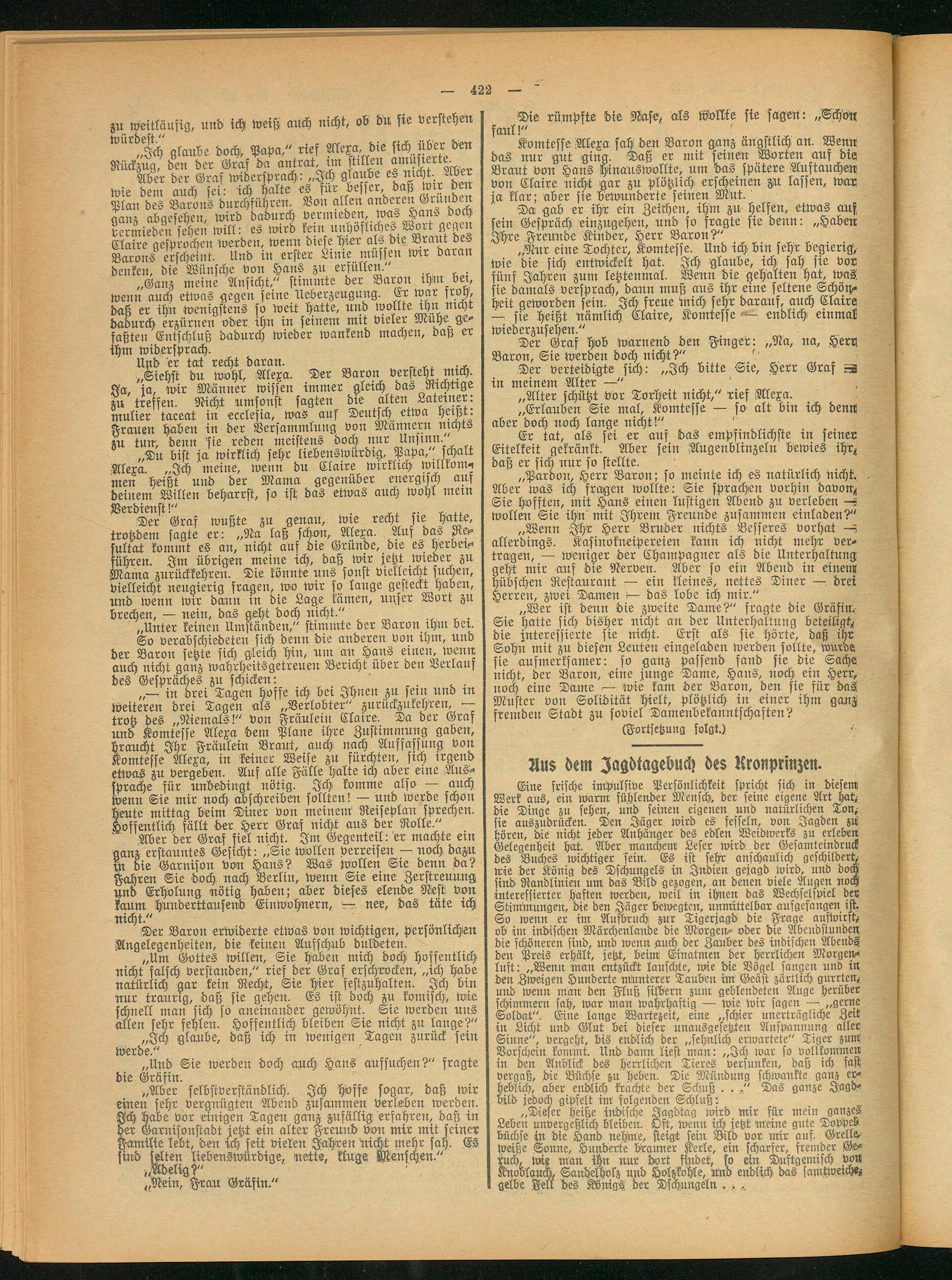 Komtesse Alexa sah den Baron ganz ängstlich an. Wenn das nur gut ging. Daß er mit seinen Worten auf die Braut von Hans hinauswollte, um das spätere Auftauchen von Claire nicht gar zn plötzlich erscheinen zu lassen, war ja klar; aber sie bewunderte seinen Mut.