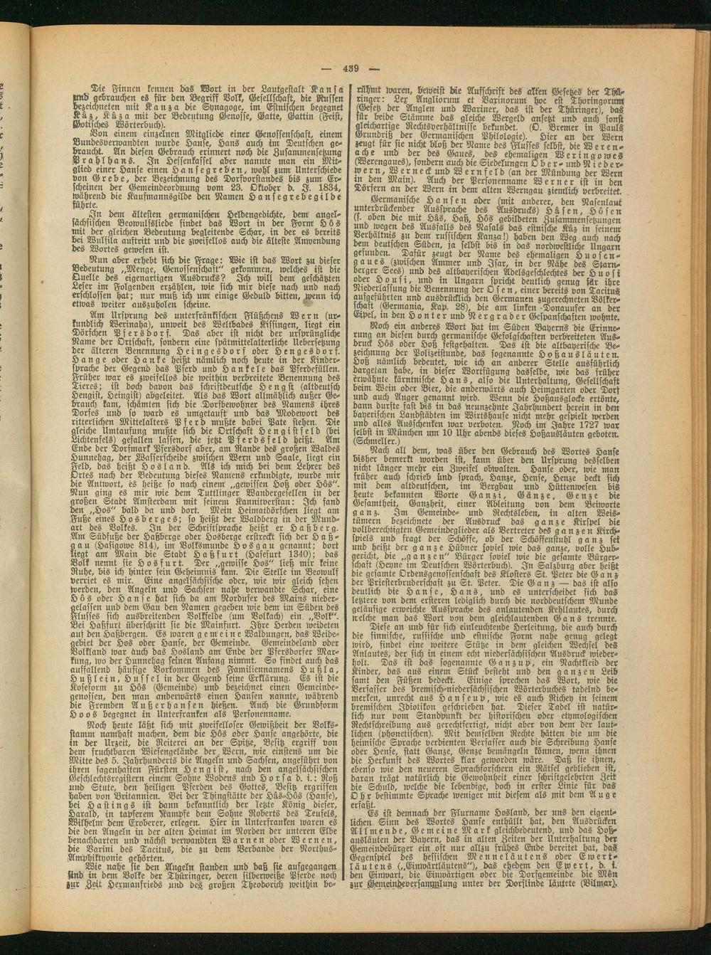Es ist demnach der Flurname Hosland, der uns den eigentlichen Sinn des Wortes Hanse enthüllt hat, den Ausdrücken Allmende, Gemeine Mark gleichbedeutend, und das Hoßausläuten der Bayern, das in alten Zeiten der Unterhaltung der Gemeindebürger ein oft nur allzu frühes Ende bereitet hat, das Gegenspiel des hessischen Menneläutens oder Ewertläutens („Einwärtläutens"), das ehedem den Ewert, t>. i. den Einwart, die Einwärtigen oder die Dorfgemeinde die Msn zur GemeistdevcrsauWlimg unter der .Dorflinde läutete (Vilmar).,