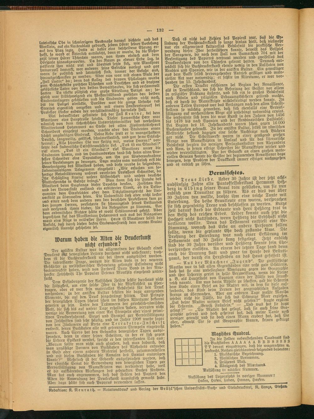 infi-rpffante Frage, warum die Alten diese IN per neucriui Geschickte zu welthistorischer Bedeutung gelangw Erfindung Nicht wÄwWOI ttaakn aber es war kein materielles Bedürfnis für den Druck vorbanden- in der antiken Kultur fehlten die dazu anregenden Elemente 'die auf den Druck hingedrängt hätten. Das Prinzip der beweglichen Typen scheint schon im frühen Altertume bekannt gewesen zu sein. Unter den Trümmern der griechisch-römischen Welt die sich bis auf unsere Tage erhalten haben, verraten Nicht wenige die Verwertung von einer Art Stempeln oder>eines pnmi- tiven Druckverfahrens. Siegel und Stempel KM ^rvielsaltigung von Inschriften sind sehr häufig, und im ^ahre 1908 wurde sogar von den Italienern auf Kreta eine Terra tot t a - a n f tftr ifii entdeckt, deren Buchstaben alle mit getrennten Stempeln eulgepreßt waren. Auch Cicero hat den Gedanken beweglicher Typen auSge-- sprochen, denn in einer seiner Schriften,, tn der er üegcn die Lehren Epikurs wendet, spricht er den interessanten Satz aus. „Warum sollte man nicht anch glauben, daß man dadurch, daß man unzählige Formen von Buchstaben des Alphabets entweder in Gold oder einem anderen Material herstellt, zusammenstellen und mit diesen Buchstaben die Annalen des Eiinrus auspragen könnte?" Mehrfach ist der Gedanke ausgesprochen worden, daß der römische Senat die Verwendung von beweglichen Aypen zur Vervielfältigung von Manuskripten nur verhindert Hube, wert er die aufklärenden Wirkungen des gedruckten Buches fürchtete. Mait hat auch angenommen, daß das Fehlen des Papiers den Alten die Anwendung der Druckerkunst iimnöglich gemacht habe. Aber dazu hätte sich auch Papyrus verwenden lassen.