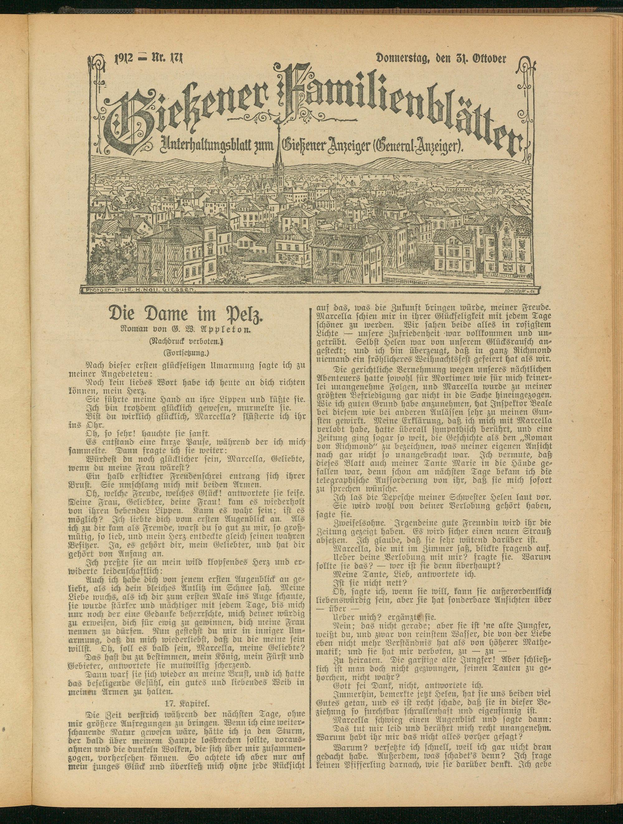 Die Zeit verstrich während der nächsten Tage, ohne mir größere Aufregungen zu bringen. Wenn ich eine weiter- schanende Natur gewesen wäre, hätte ich ja den Sturm, der bald über meutern Haupte losbrechen sollte, voraus- ahnen und die dunkeln Wolken, die sich über mir zusammenzogen, vvrhersehen können. So achtete ich aber nur auf mein junges Glück und überließ mich ohne jede Rücksicht
