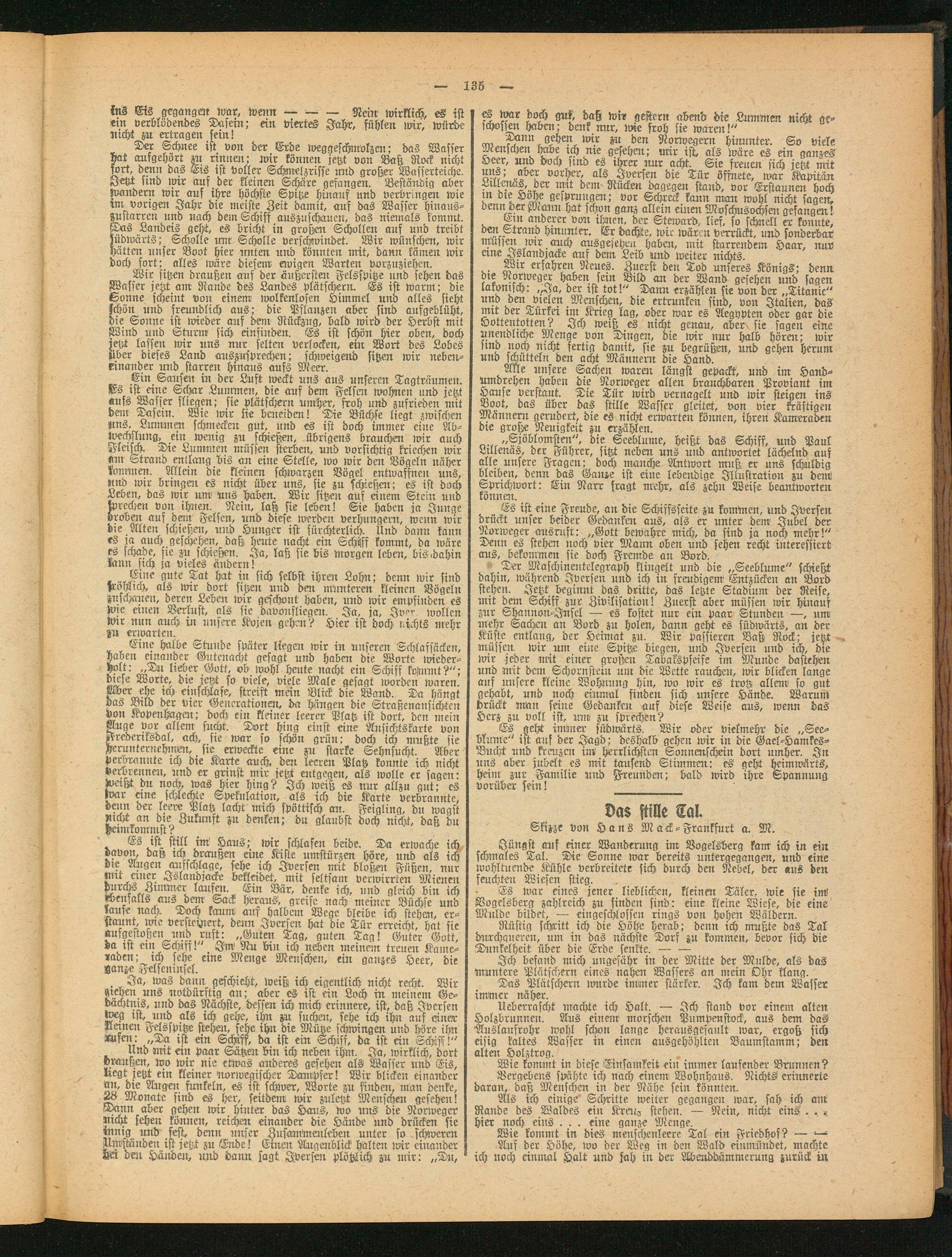 Unb mit ein paar Sätzen bin ich neben ihm. Ja, wirklich, dort brausten, wo wir nie etwas anderes gesehen als Wasser und Eis, «egt retzt ein kleiner Norwegischer Dampfer! Wir blicken einander an, die Augen fmtkeln, es ist schwer, Worte zu finden, Man denke, 28 Monate sind es her, seitdem wir zuletzt Menschen gesetzeit! Dann aber gehen wir hinter das Haus, wo uns die Norweger nickst sehen können, reichen einander bie Hände und drücken sie innig und fest, denn unser ZusamMeickeben unter so schweren Umständen ist jetzt zu Ende! Einen Augenblick halten wir ciitanber den Händen, und dann sagt Jversen plötzlich zu mir : „Du,
