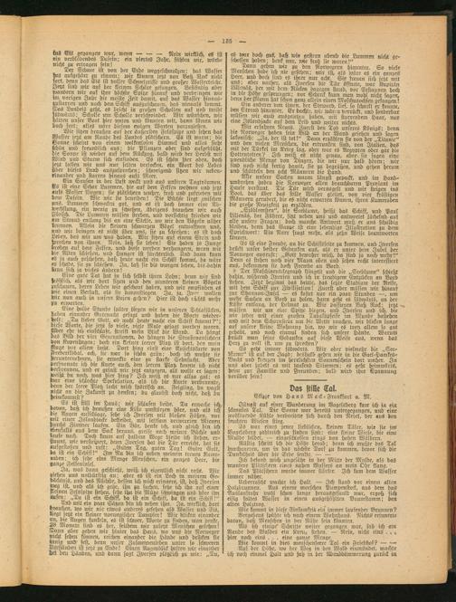 Es war eines jener lieblichen, kleinen Täler, wie sie iM Vogelsberg zahlreich zu finden sind: eine kleine Wiese, bie eine Mulbe bilbet, — eingesckstossen rings von hohen Wäldern.