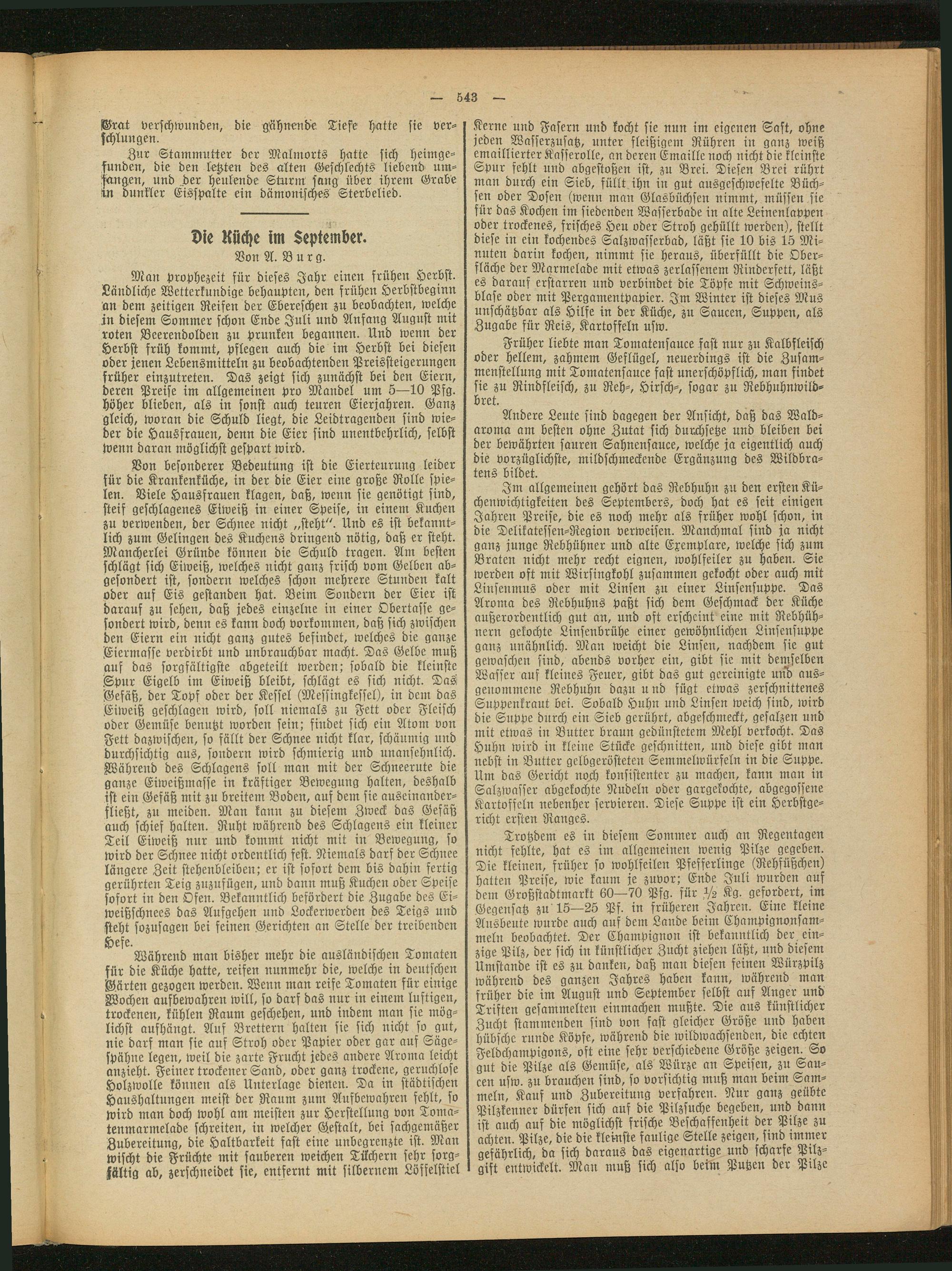Während man bisher mehr die ausländischen Tomaten für die Küche hatte, reifen nunmehr die, welche in deutschen Gärten gezogen werden. Wenn man reife Tomaten für einige Wochen aufbewahren will, so darf das nur in einem luftigen, trockenen, kühlen Raum geschehen, und indem man sie möglichst aufhängt. Auf Brettern halten sie sich nicht so gut, nie darf man sie auf Stroh oder Papier oder gar auf Säge- spähne legen, weil die zarte Frucht jedes andere Aroma leicht anzieht. Feiner trockener Sand, oder ganz trockene, geruchlose Holzwolle können als Unterlage dienen. Da in städtischen Haushaltungen meist der Raum zum Aufbewahren fehlt, so wird man doch wohl am meisten zur Herstellung von Tomatenmarmelade schreiten, in welcher Gestalt, bei sachgemäßer Zubereitung, die Haltbarkeit fast eine unbegrenzte ist. Man wischt die Früchte mit sauberen weichen Tüchern sehr sorgfältig ab, zerschneidet sie, entfernt mit silbernem Löffelstiel