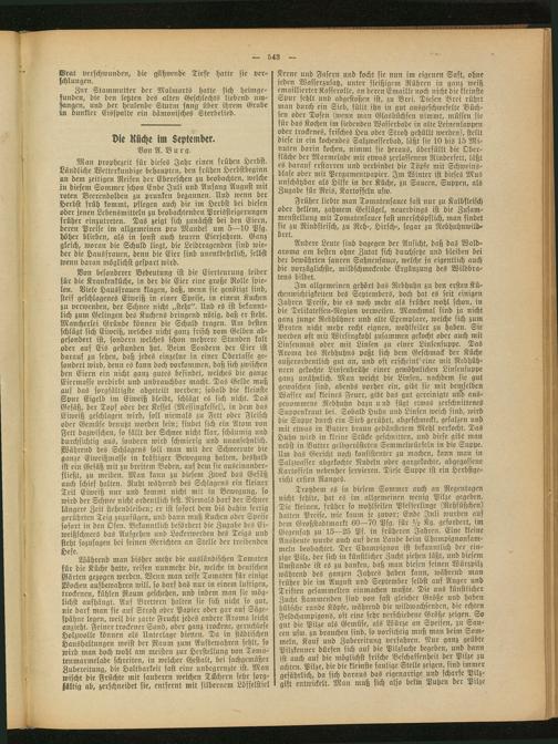 Andere Leute sind dagegen der Ansicht, daß das Waldaroma am besten ohne Zutat sich durchsetze und bleiben bei der bewährten sauren Sahnensauce, welche ja eigentlich auch die vorzüglichste, mildschmeckende Ergänzung des Wildbratens bildet.