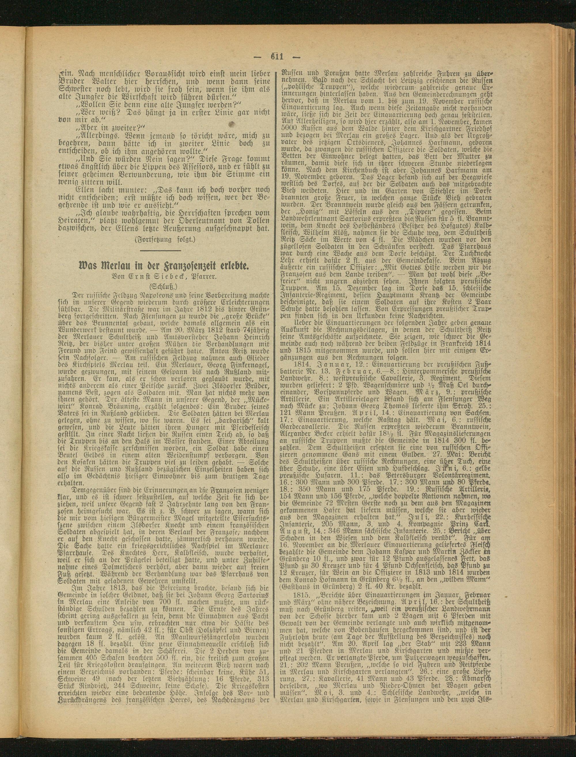 Demgegenüber sind die Erinnerungen, an die Franzosen weniger klar, und es ist schwer festzustellen, auf welche Zeit sie sich beziehen, weil unsere Gegend fast 2 Jahrzehnte lang von den Franzosen heimgesucht war. Es ist z. B. schwer zu sagen, wann sich die mir vom hiesigen Bürgermeister Magel mitgeteilte Eifersuchtsszene zwischen einem Jlsdorfer Knecht und einem französischen Soldaten abgespielt hat, in deren Verlauf der Franzose, nachdem er auf den Knecht geschossen hatte, jämmerlich verhauen wurde. Die Sache hatte ein kriegsgerichtliches Nachspiel int Merlauer Pfarrhause. Des Kitcchtes Herr, Kalbfleisch, wurde verhaftet, weil er sich nn der Prügelei beteiligt Hätte, und unter Zuhilfe-- nähme eines Dolmetschers verhört, aber dann wieder auf freien 8uß gesetzt. Während der Verhandlung Ivar das Pfarrhaus von oldaten mit geladenen Gewehren umstellt.