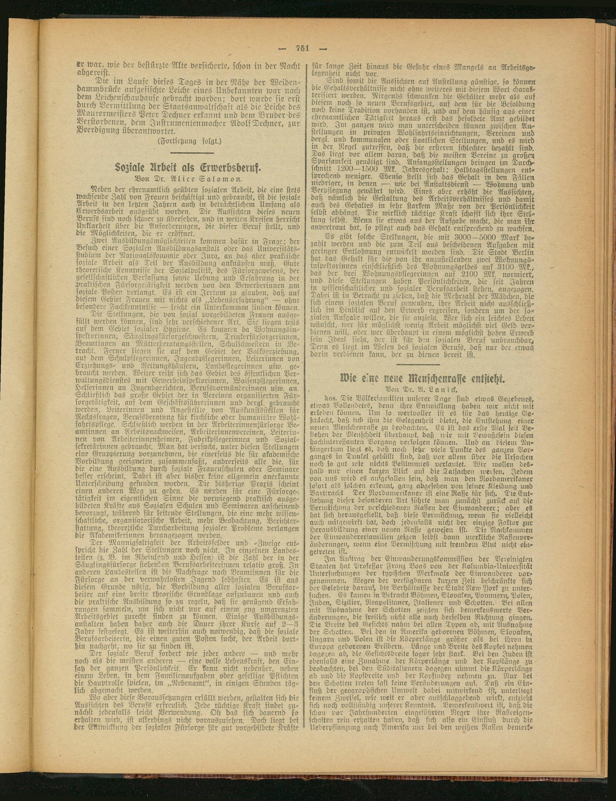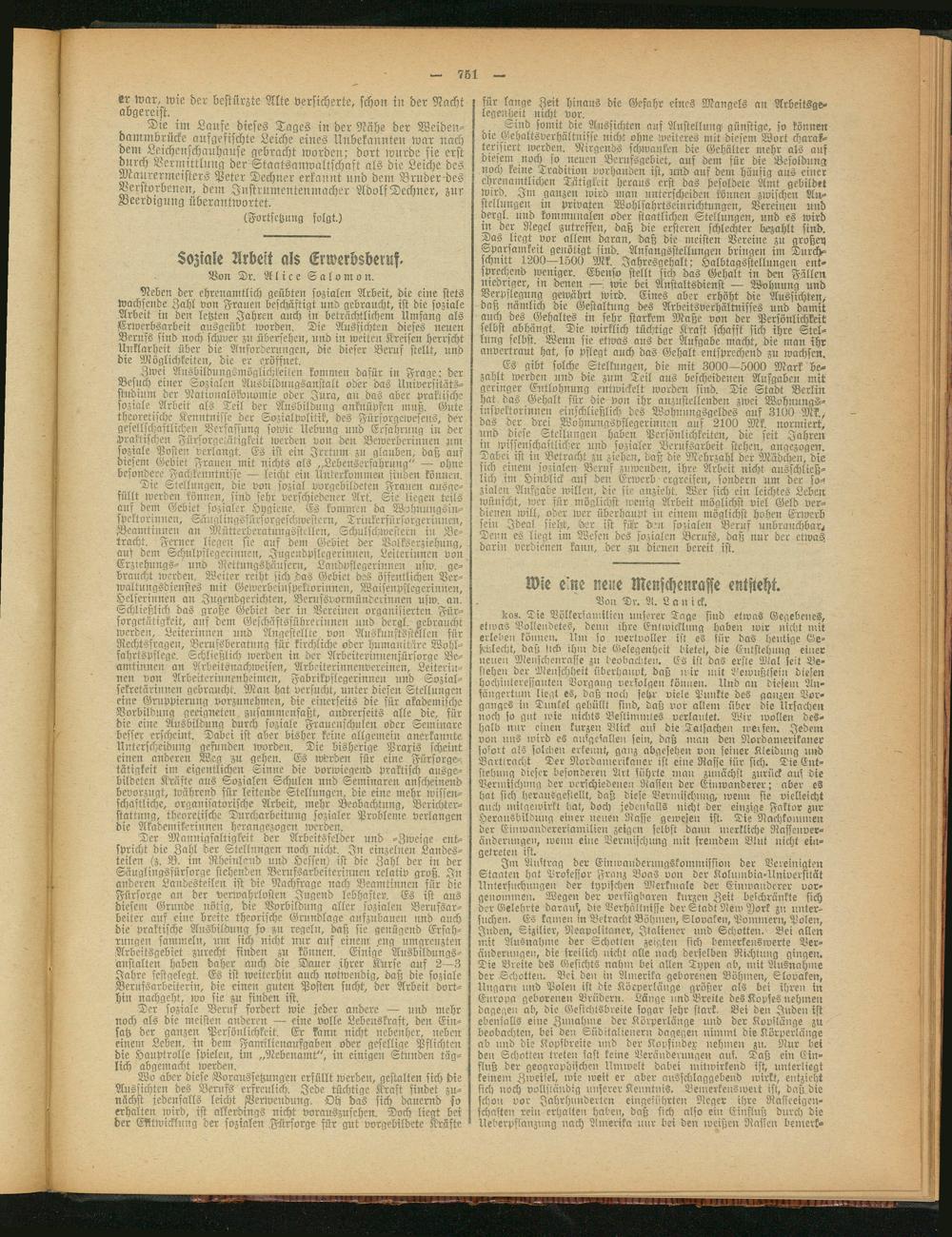 Neben der ehrenamtlich geübten sozialen Arbeit, die eine stets wachsende Zahl von Frauen beschäftigt und gebraucht, ist die soziale Arbeit in den letzten Jahren auch in beträchtlichem Umfang als jErwerbsarbeit ausgeübt worden. Die Aussichten dieses neuen Berufs sind noch schwer zu übersehen, und in weiten Kreisen herrscht Unklarheit über die Anforderungen, die dieser Beruf stellt, und die Möglichkeiten, die er eröffnet.